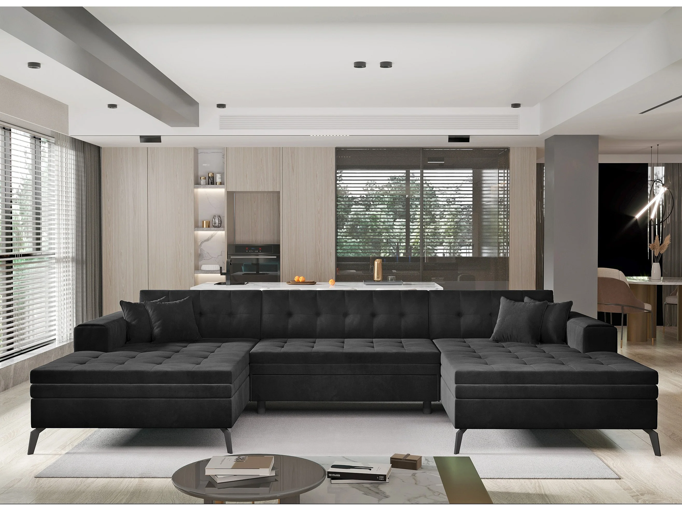 Canapé panoramique convertible droit tissu doux noir matelassé Bonty 340cm