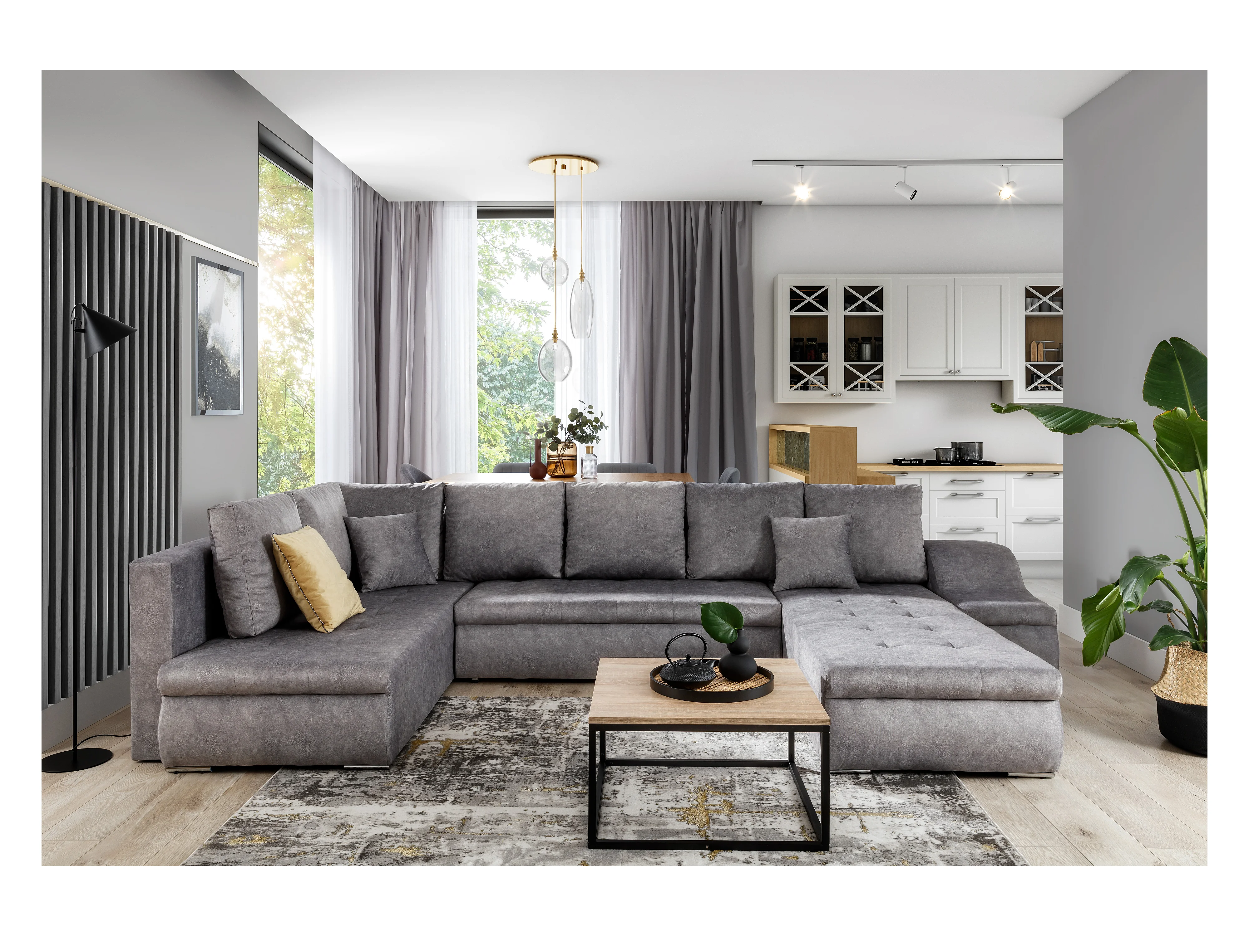 Canapé panoramique tissu gris convertible avec coffre de rangement Romano 345cm-Coffre de rangement à droite