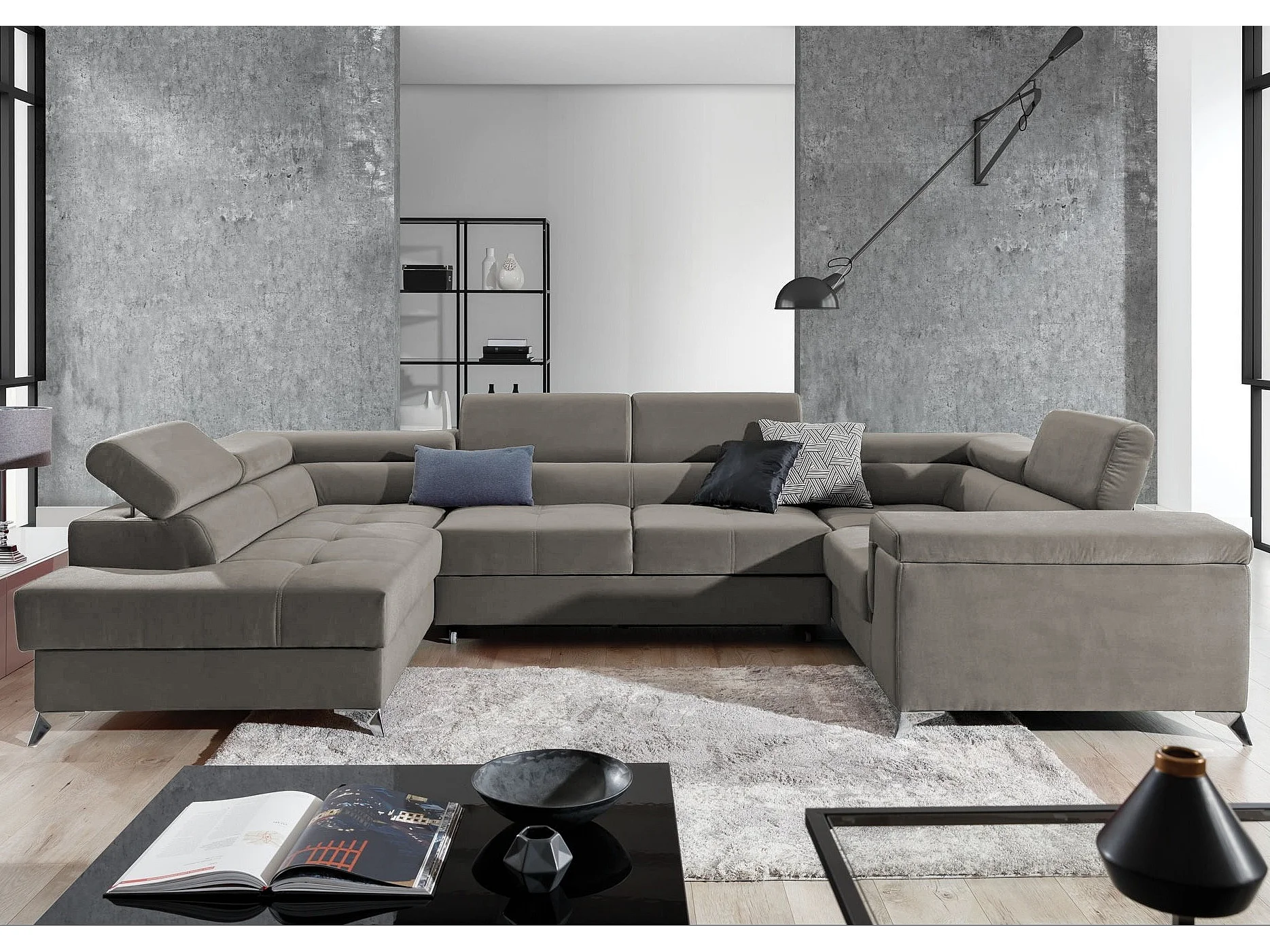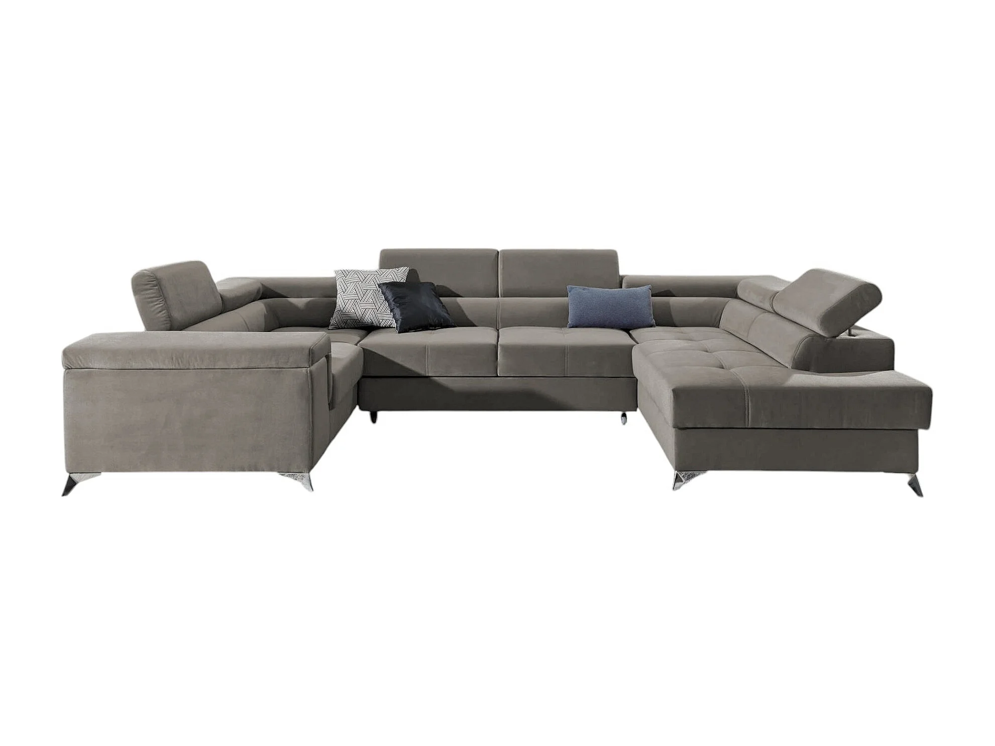 Canapé panoramique convertible TRIANO velours - têtières réglables-Beige foncé-Coffre à droite