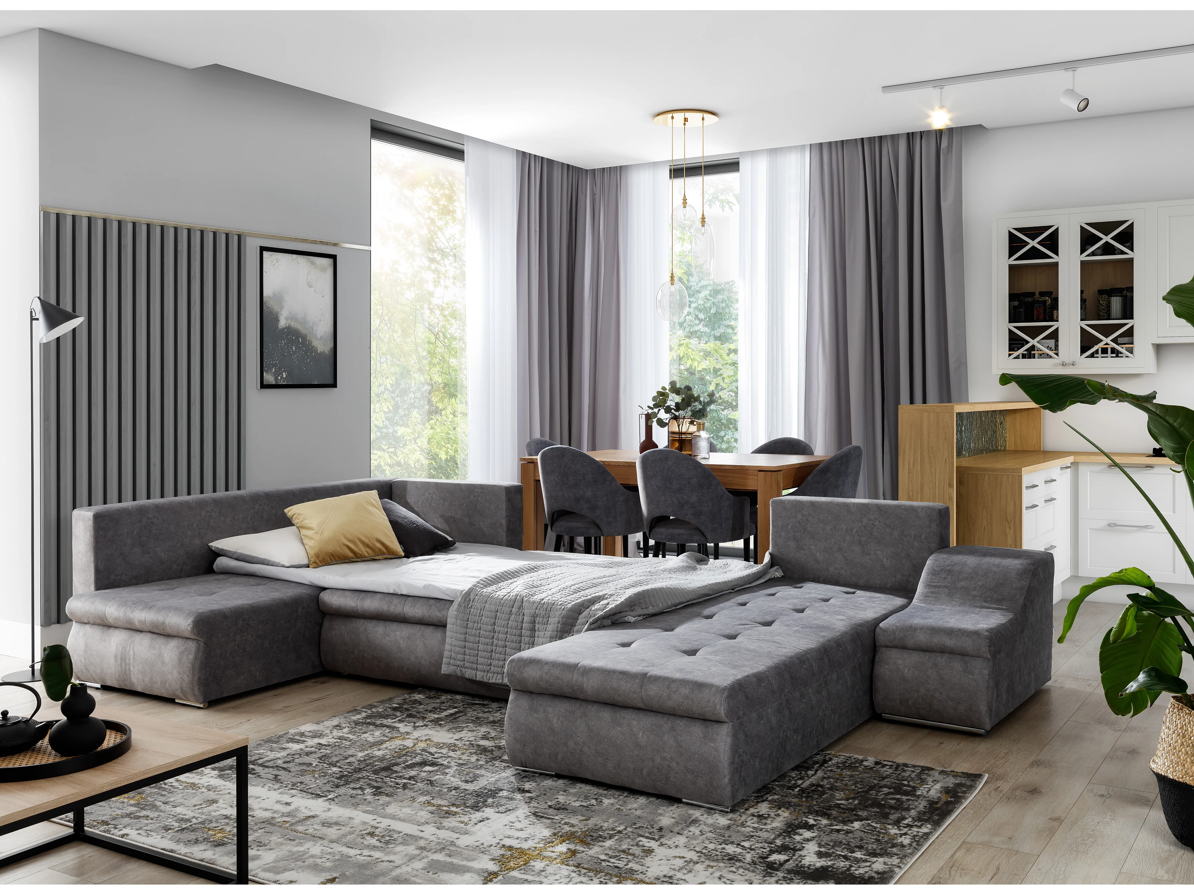 Canapé panoramique tissu bleu jean convertible avec coffre de rangement Romano 345cm-Coffre de rangement à gauche