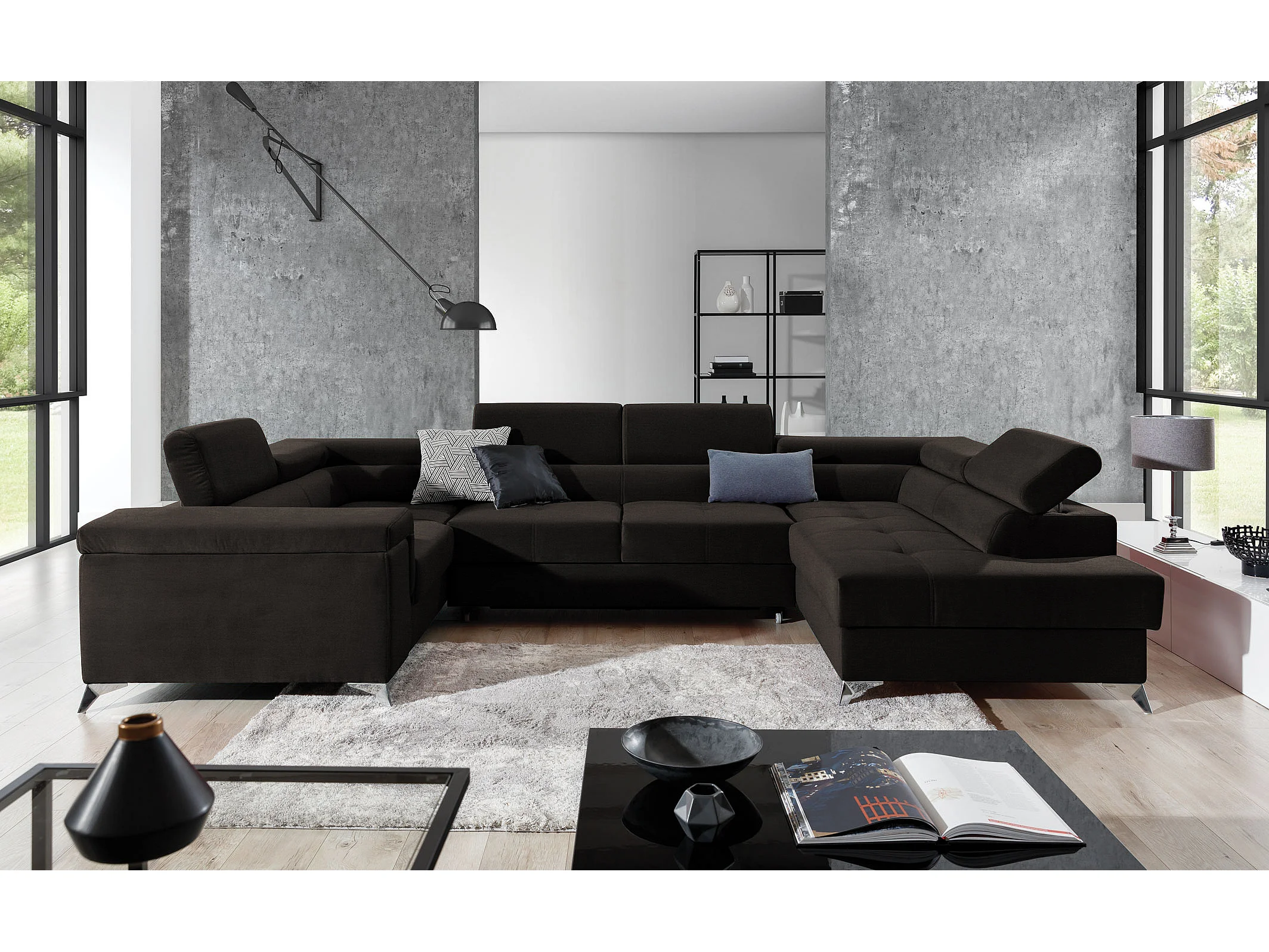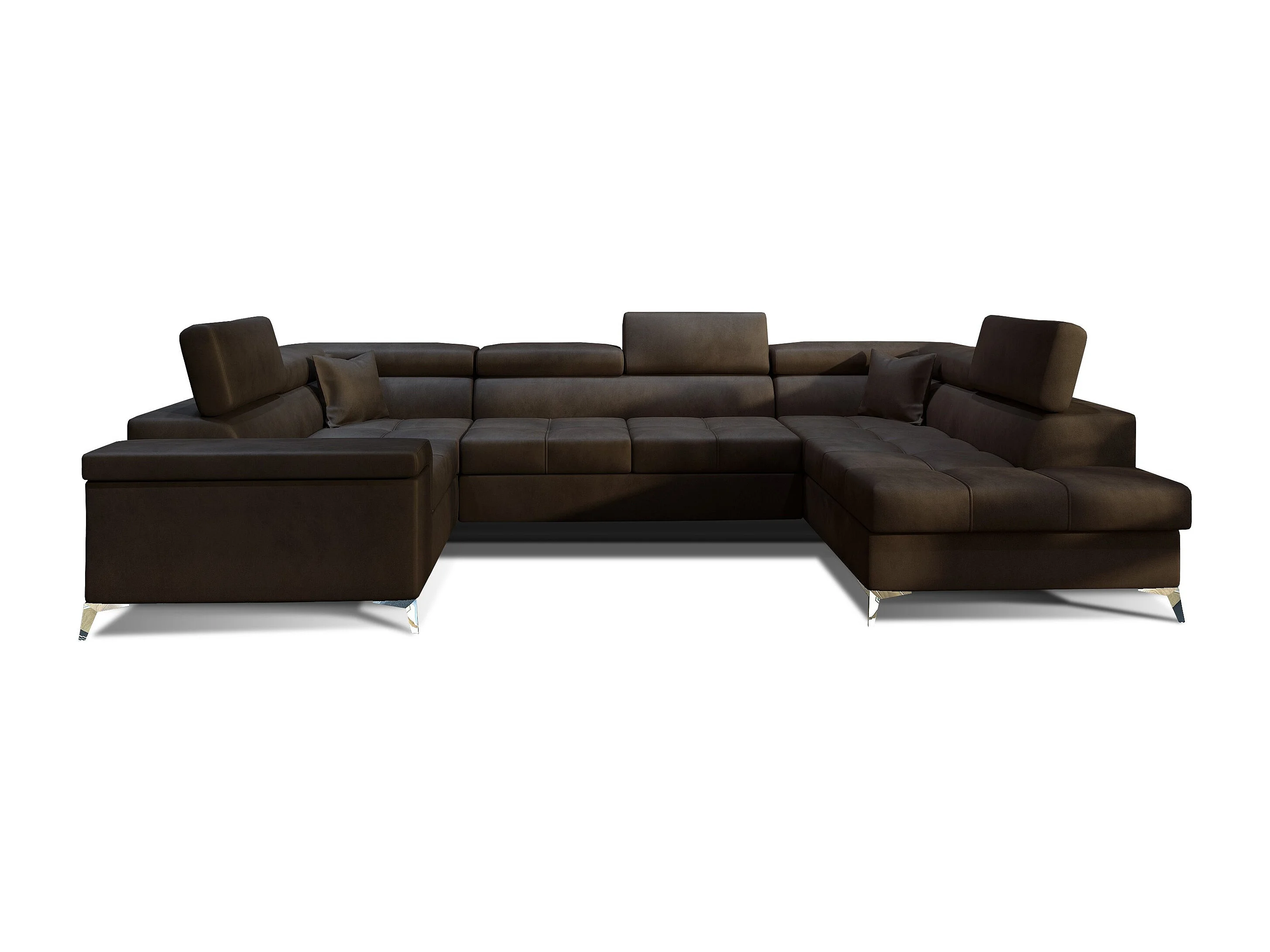 Canapé panoramique convertible TRIANO velours - têtières réglables-Marron-Coffre à droite