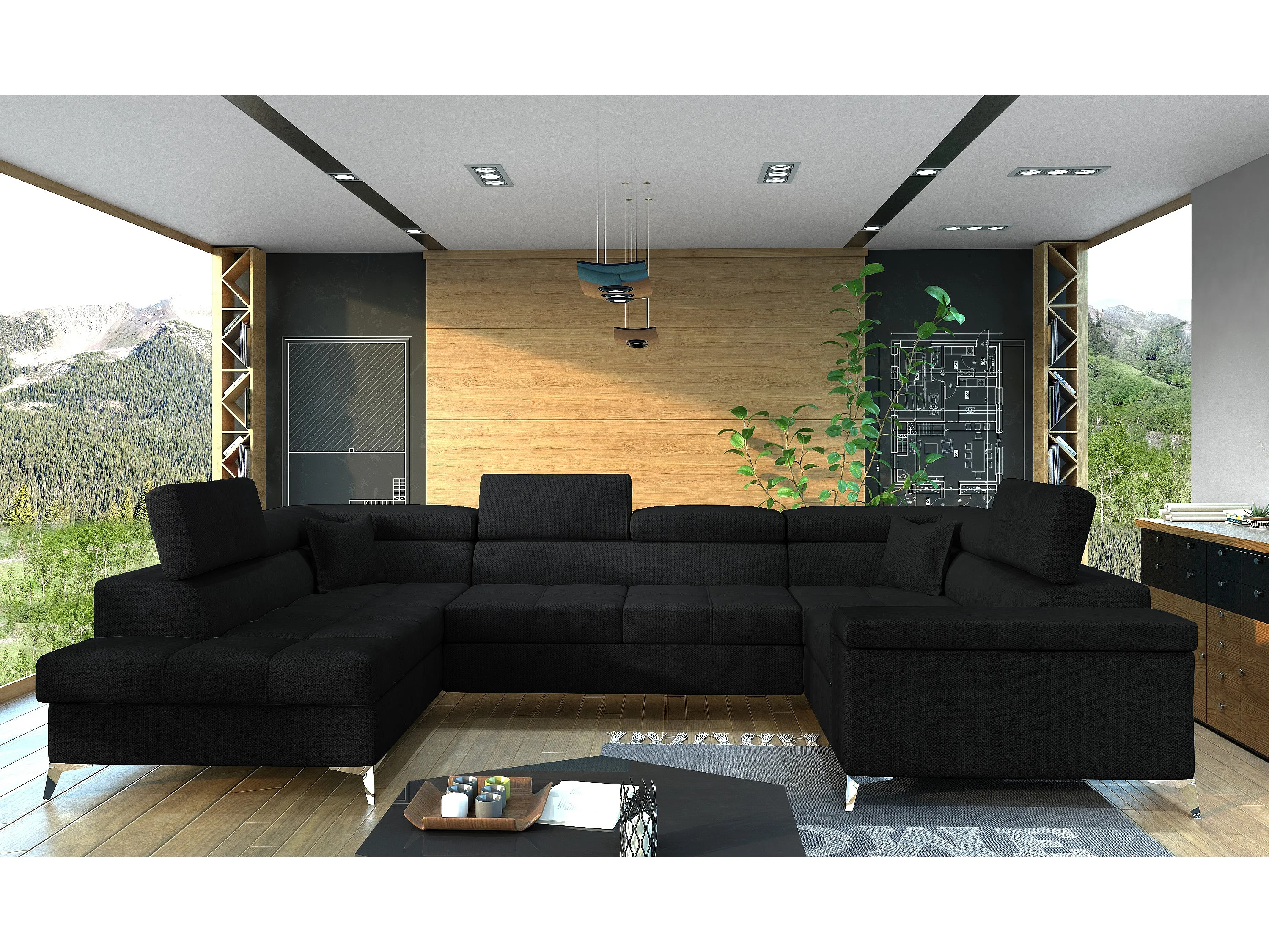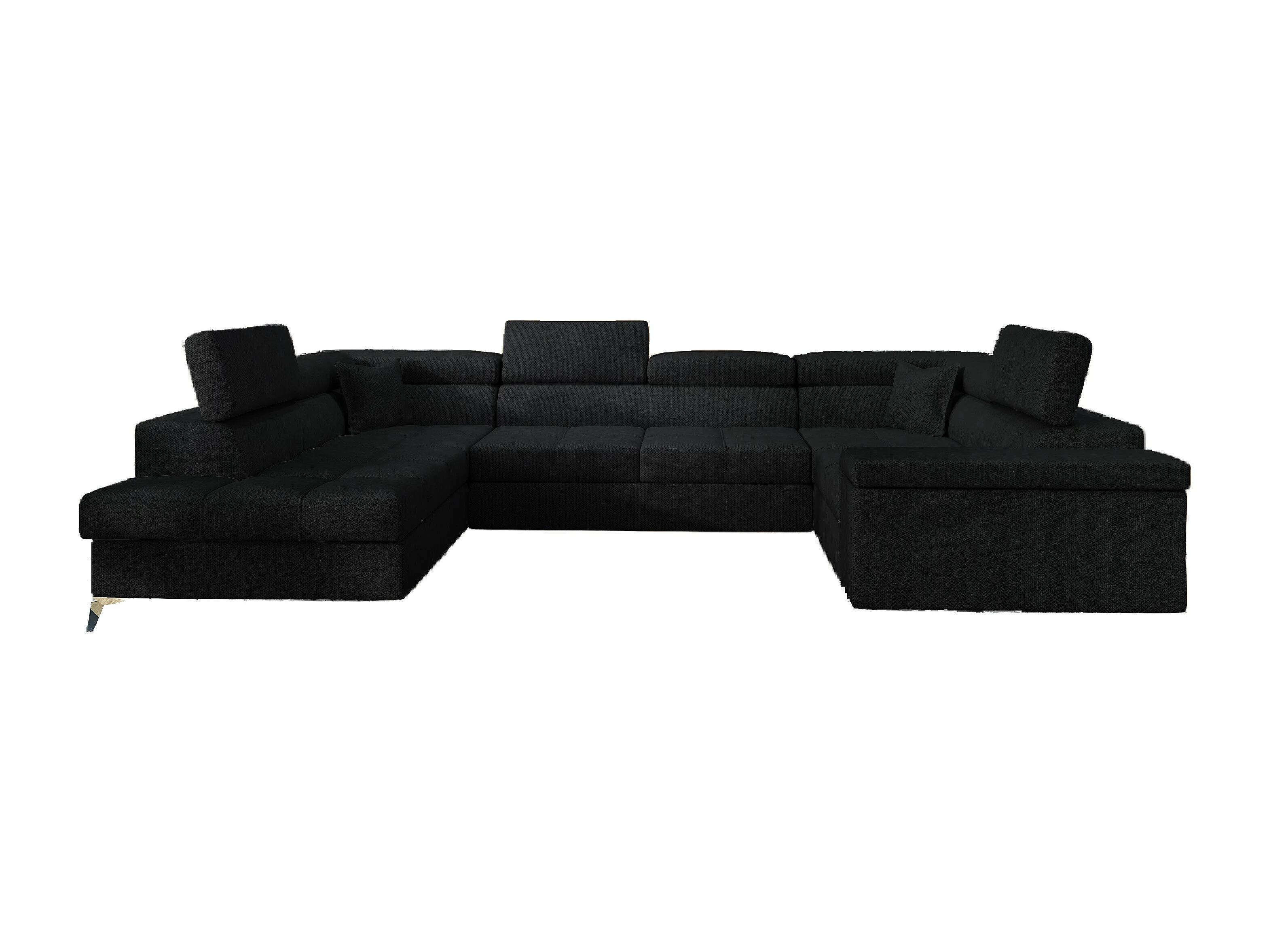 Canapé panoramique convertible TRIANO velours - têtières réglables-Noir-Coffre à gauche