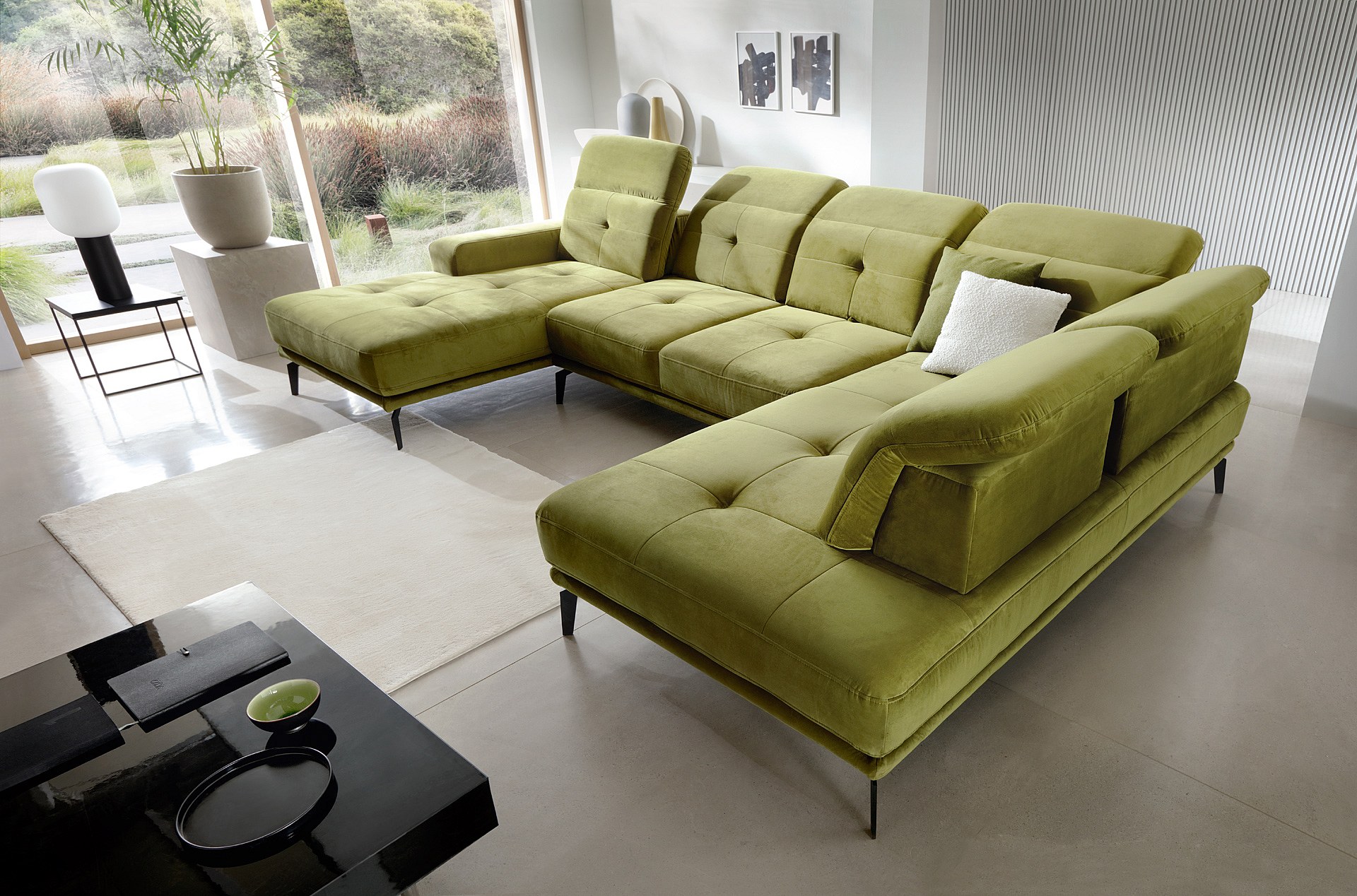 Canapé panoramique moderne tissu vert têtières angle gauche Versus 350cm