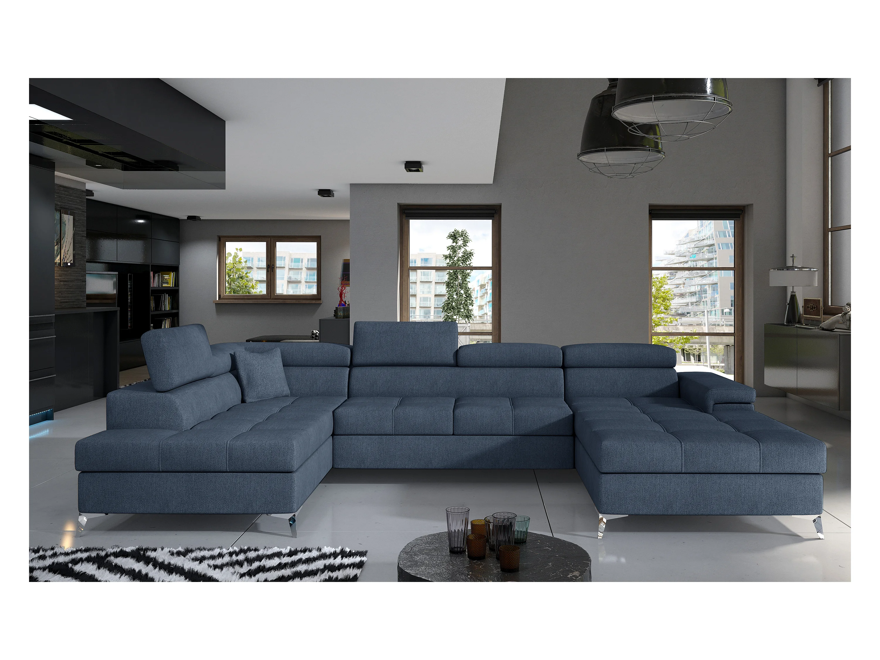 Canapé panoramique tissu bleu jean coffre de rangement à gauche Kutty 345cm