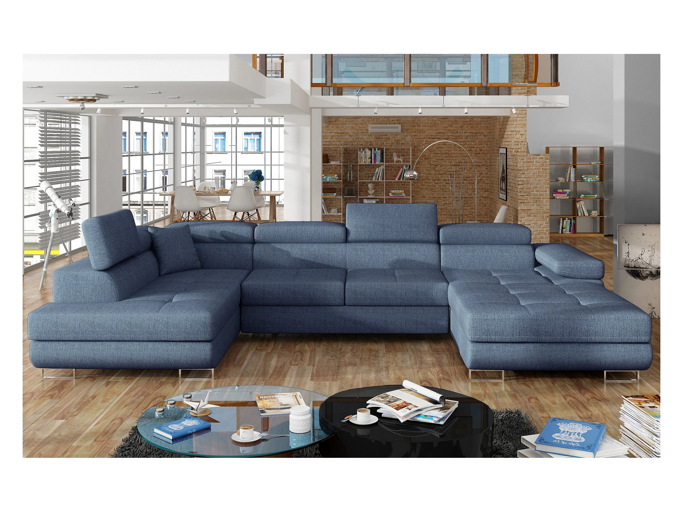 Canapé panoramique convertible tissu bleu jean avec coffre de rangement Triano 342cm-Coffre de rangement à gauche