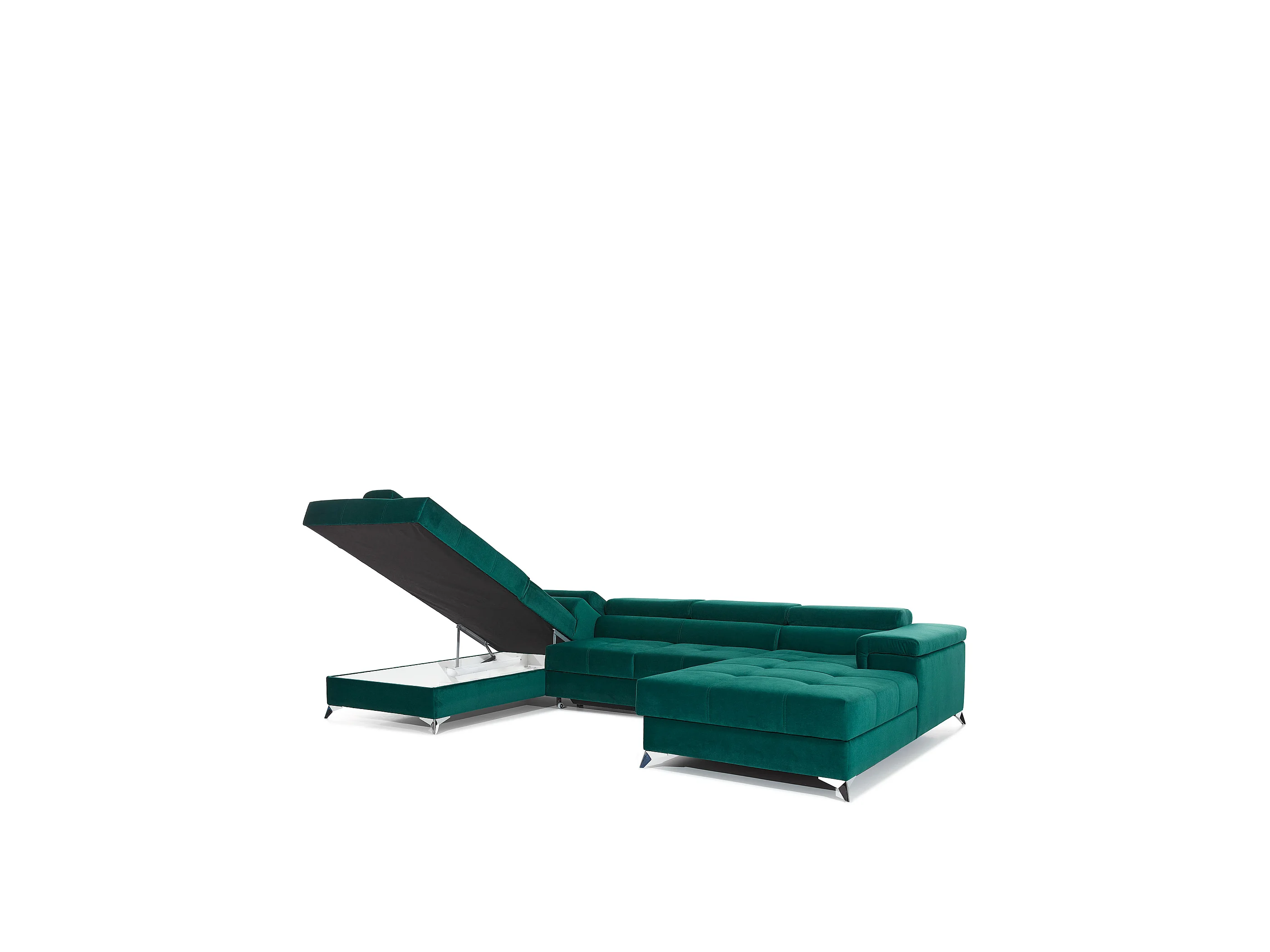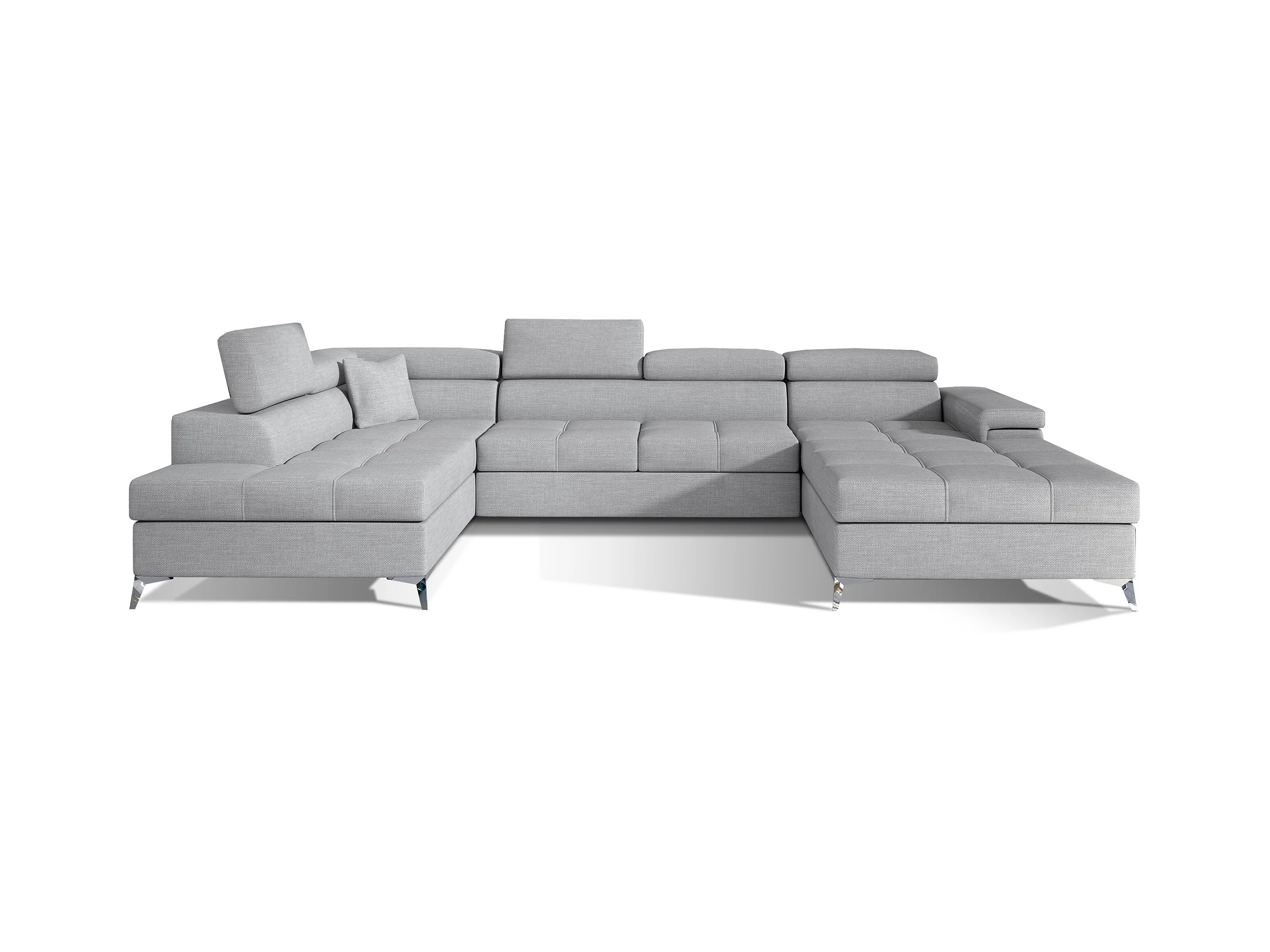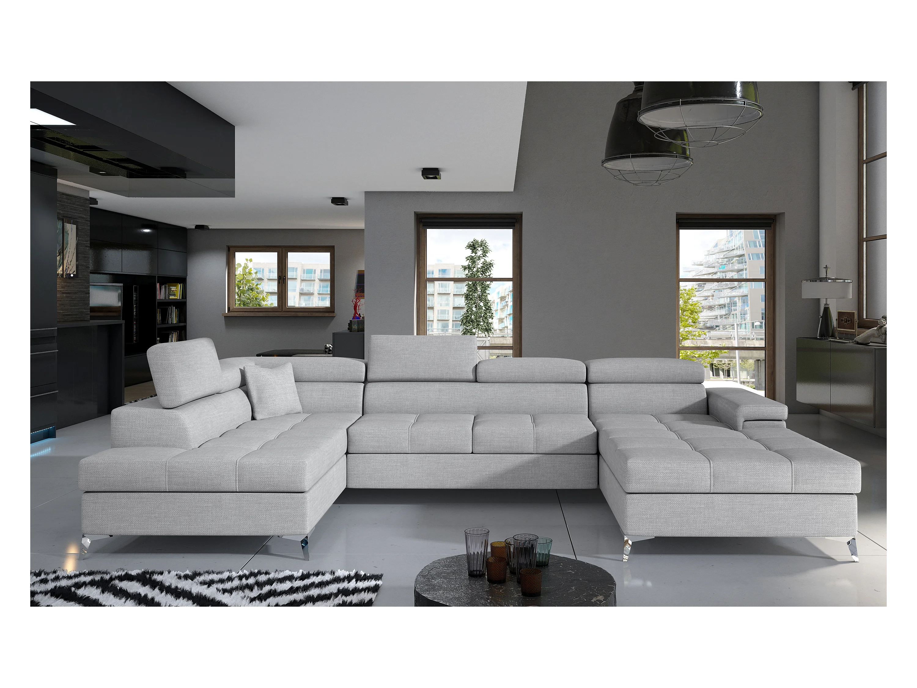 Canapé panoramique tissu gris clair coffre de rangement à gauche Kutty 345cm