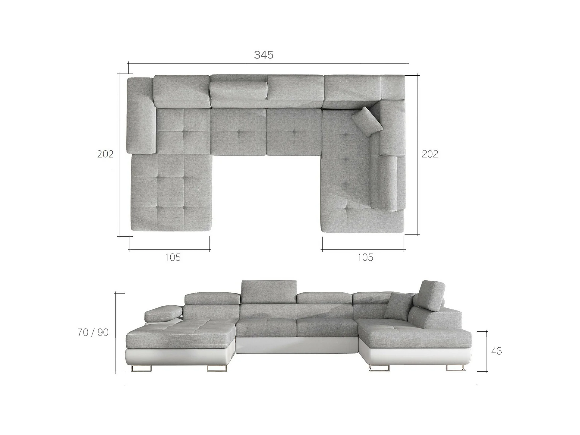 Canapé panoramique tissu gris clair chiné et simili cuir blanc convertible avec coffre de rangement Romano 345cm-Coffre de rangement à droite