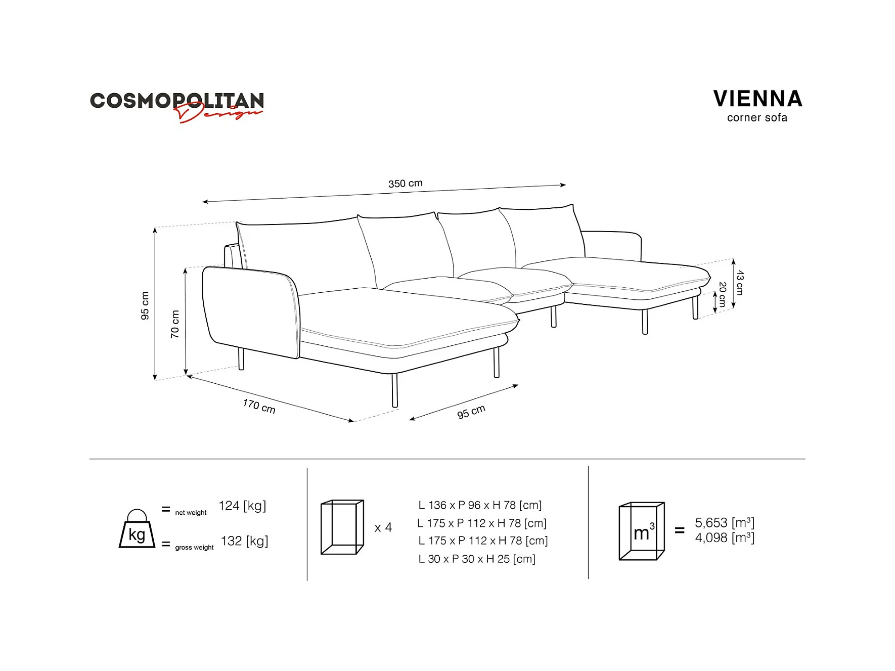 Cosmopolitan Design - Canapé panoramique "Vienna" 6 places en tissu structurel gris foncé - 350x170x95cm