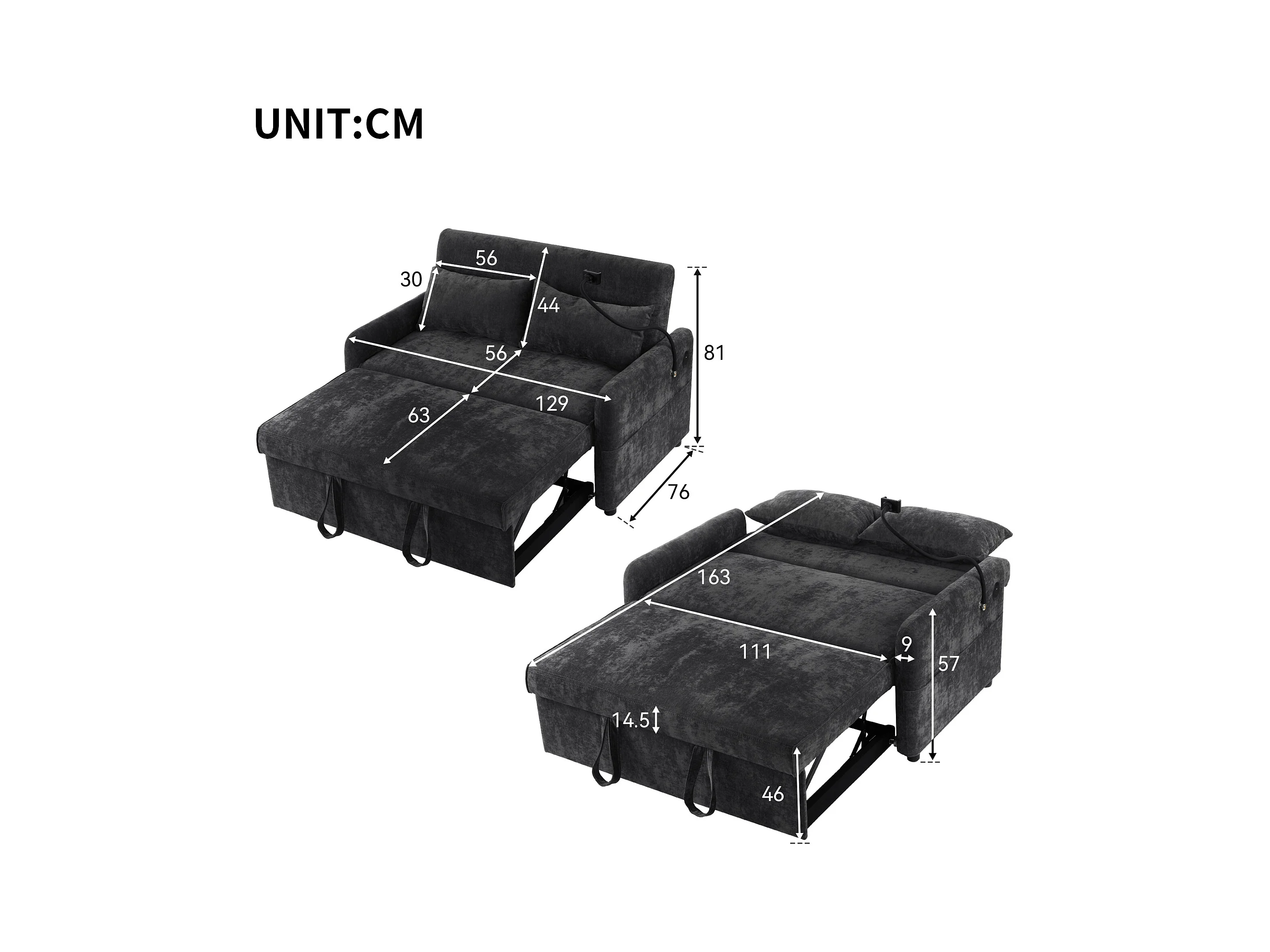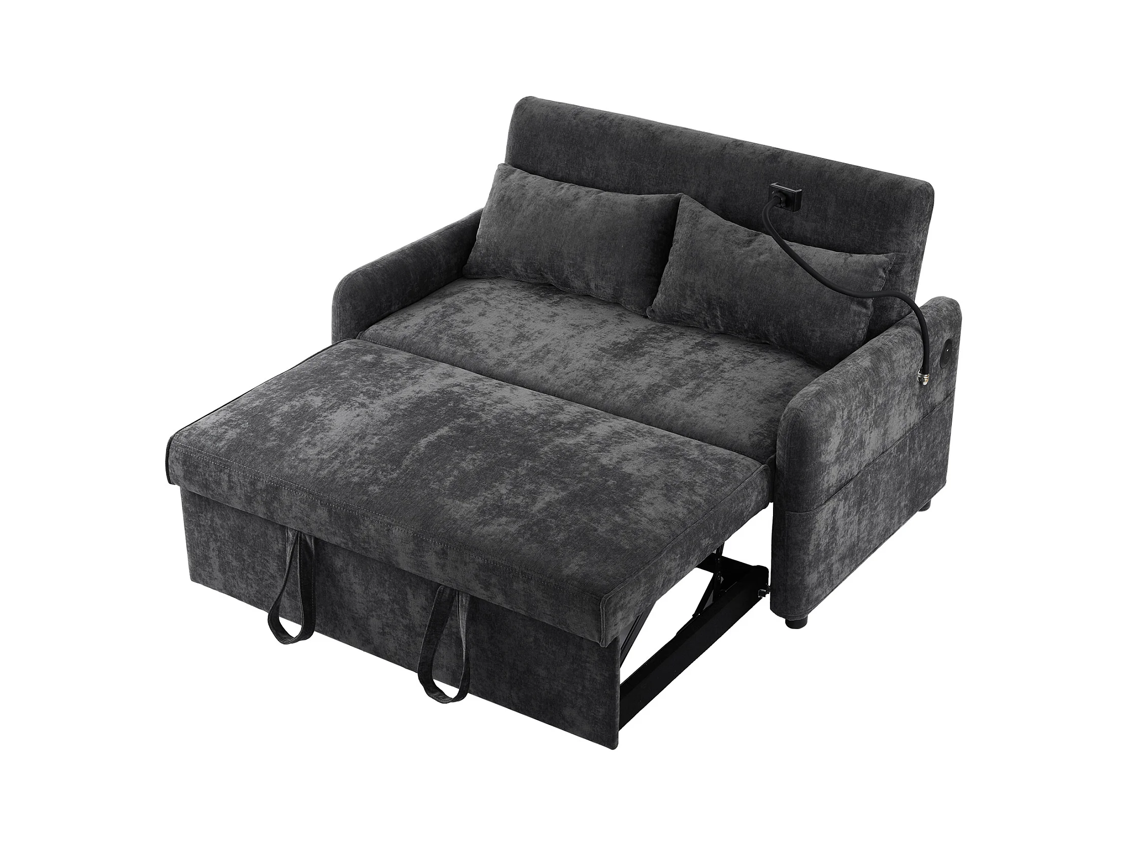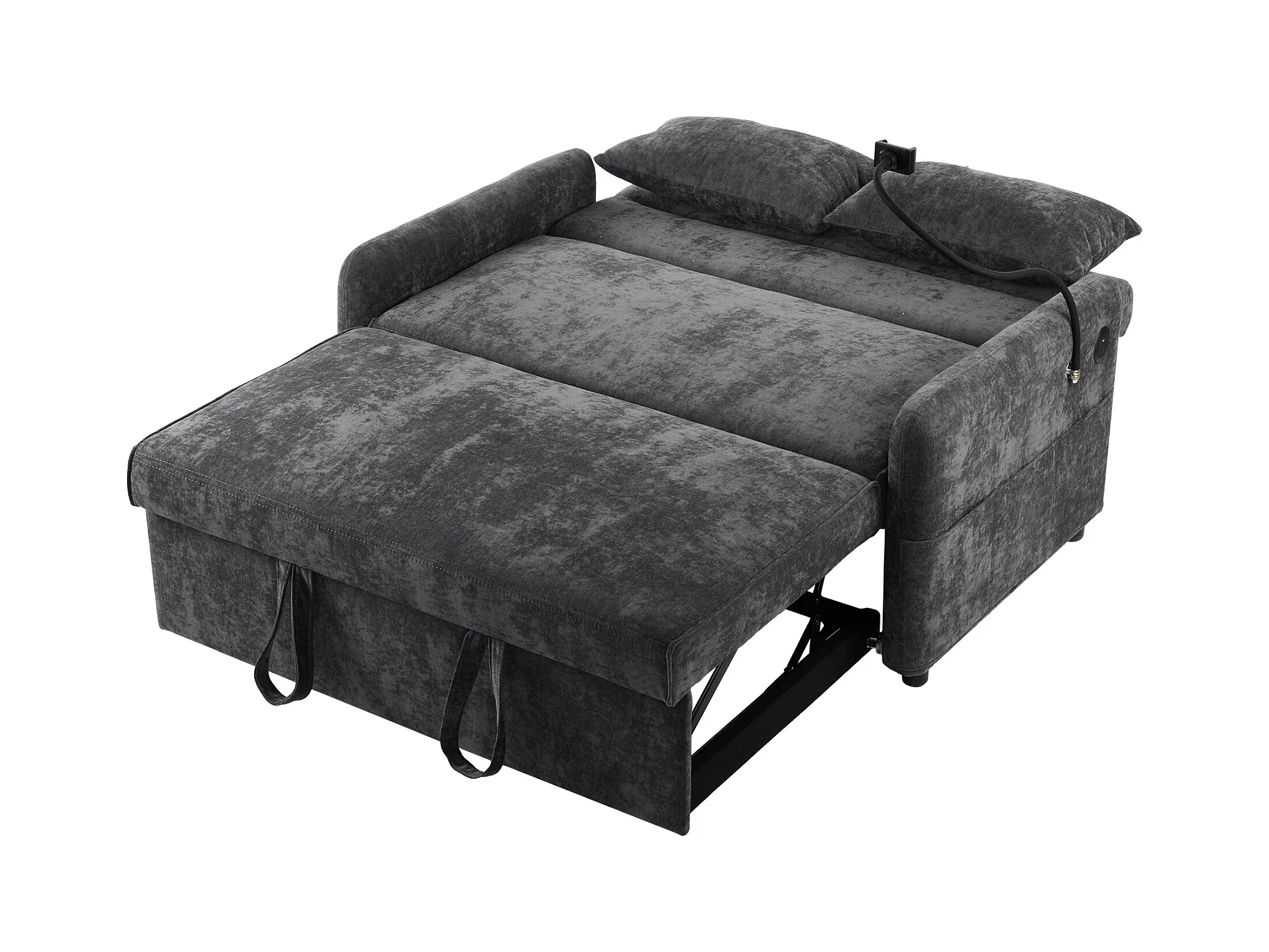 Canapé pliant 2 places, chenille gris, avec port USB et support de téléphone - pour salon et chambre