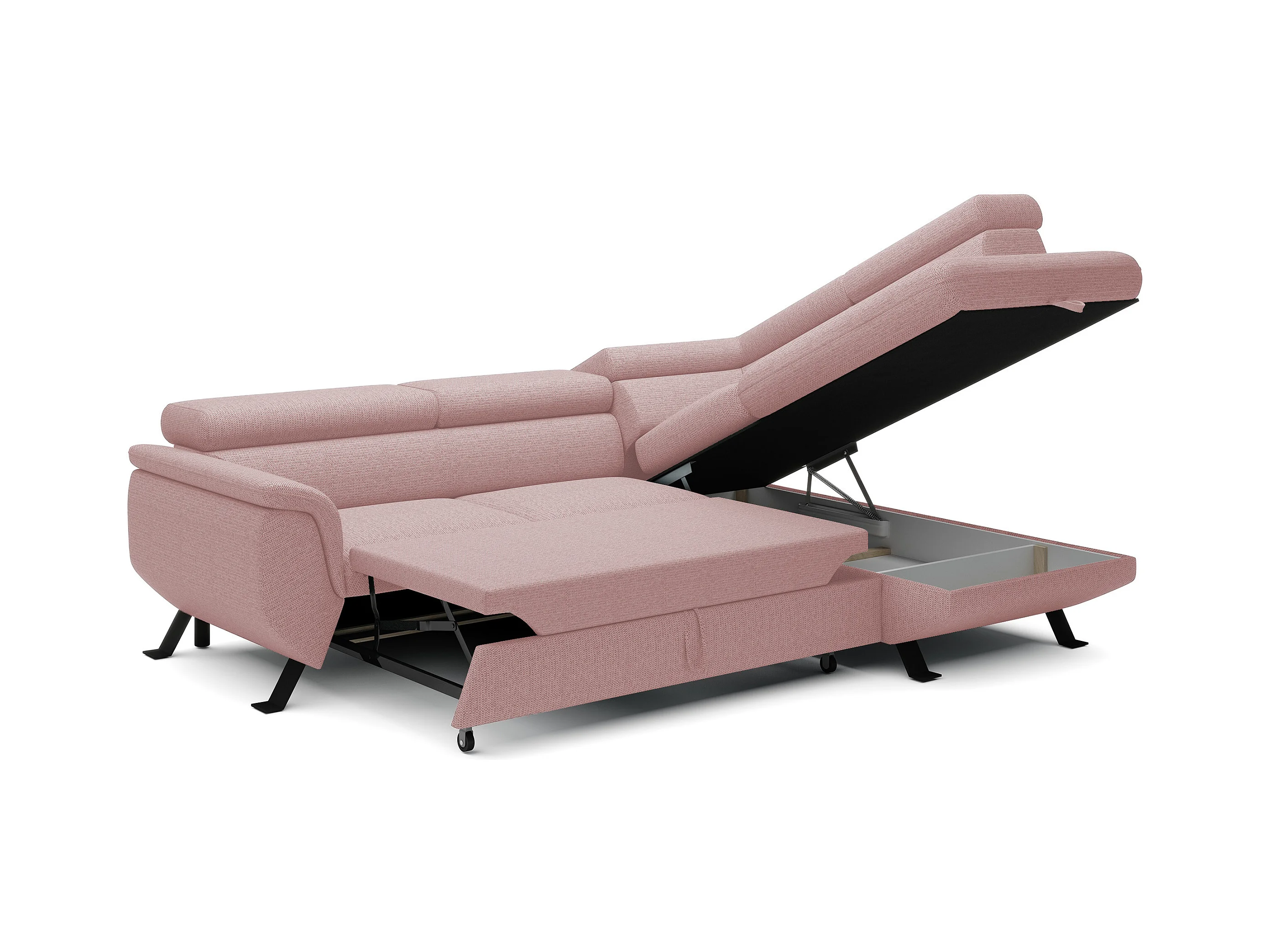 Canapé RAVEN L avec fonction de couchage, compartiment à literie, indépendant, rembourré avec têtières réglables 257x198x96 cm Côté droit Rose poudré