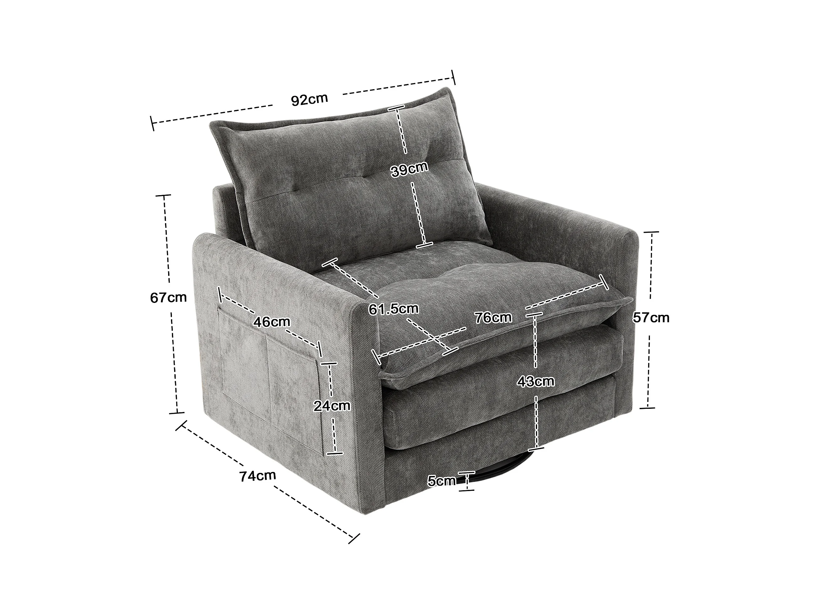 Canapé simple, chenille gris, Canapé pivotant avec accoudoirs et coussins, pour salon et chambre