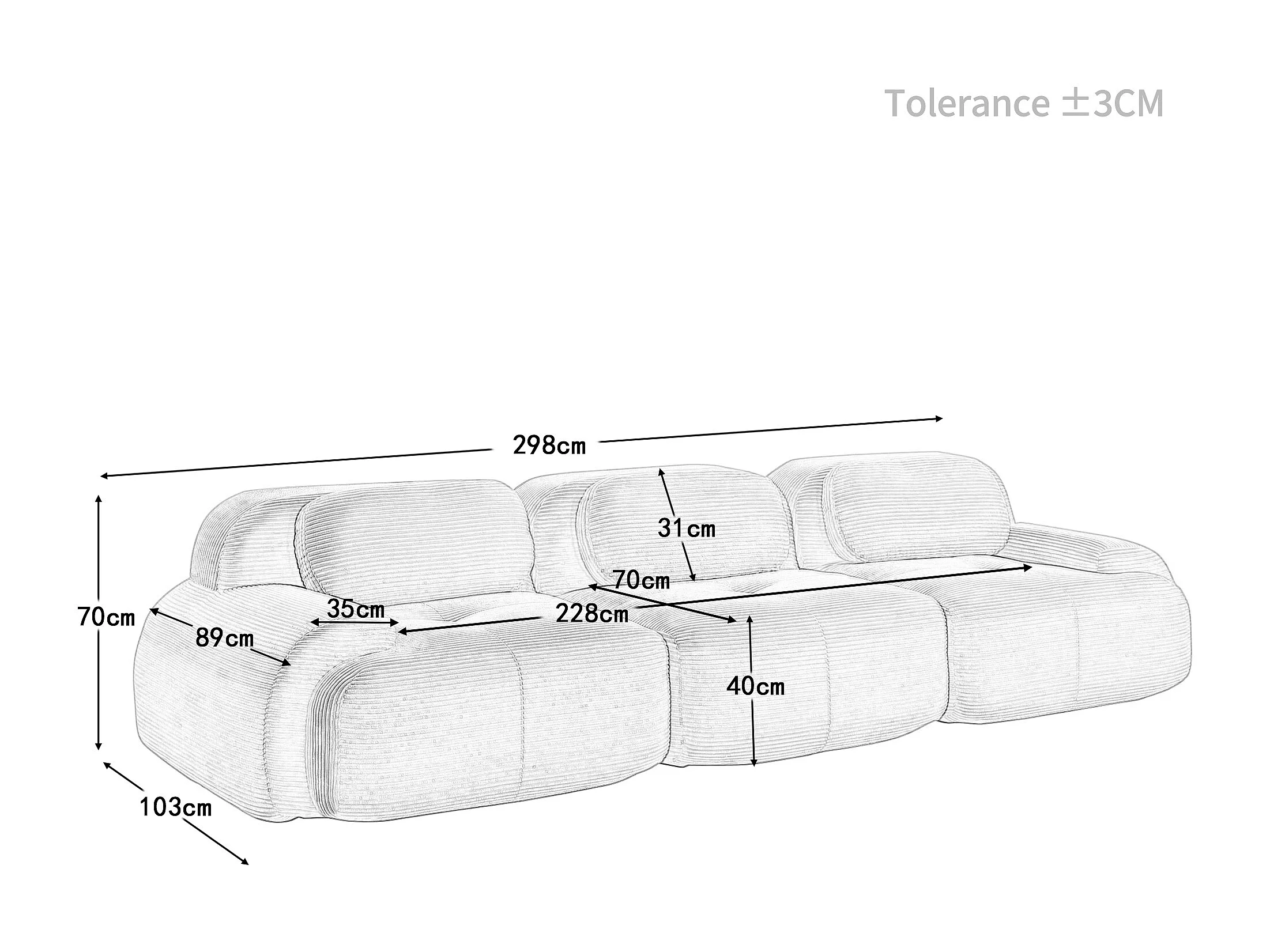 Canapé trois places, tissu velours côtelé, configuration modulaire, antidérapant, beige.