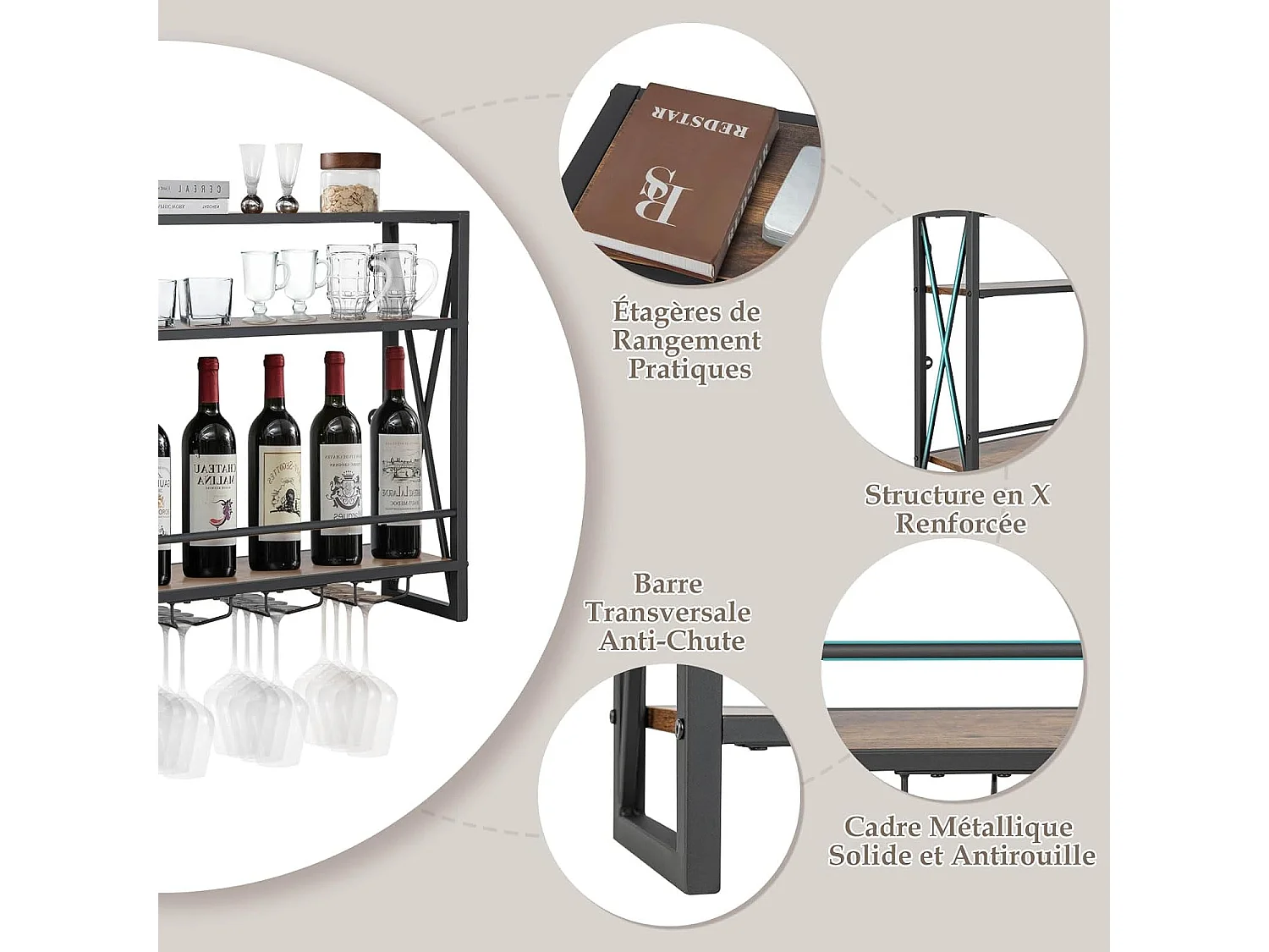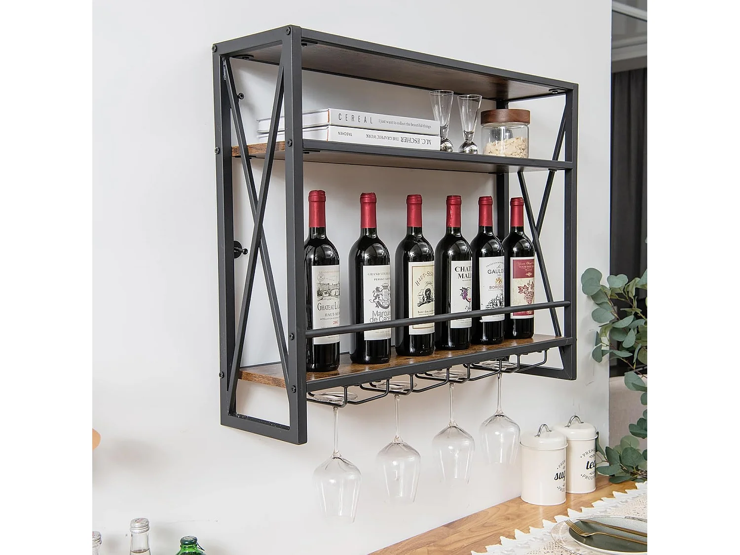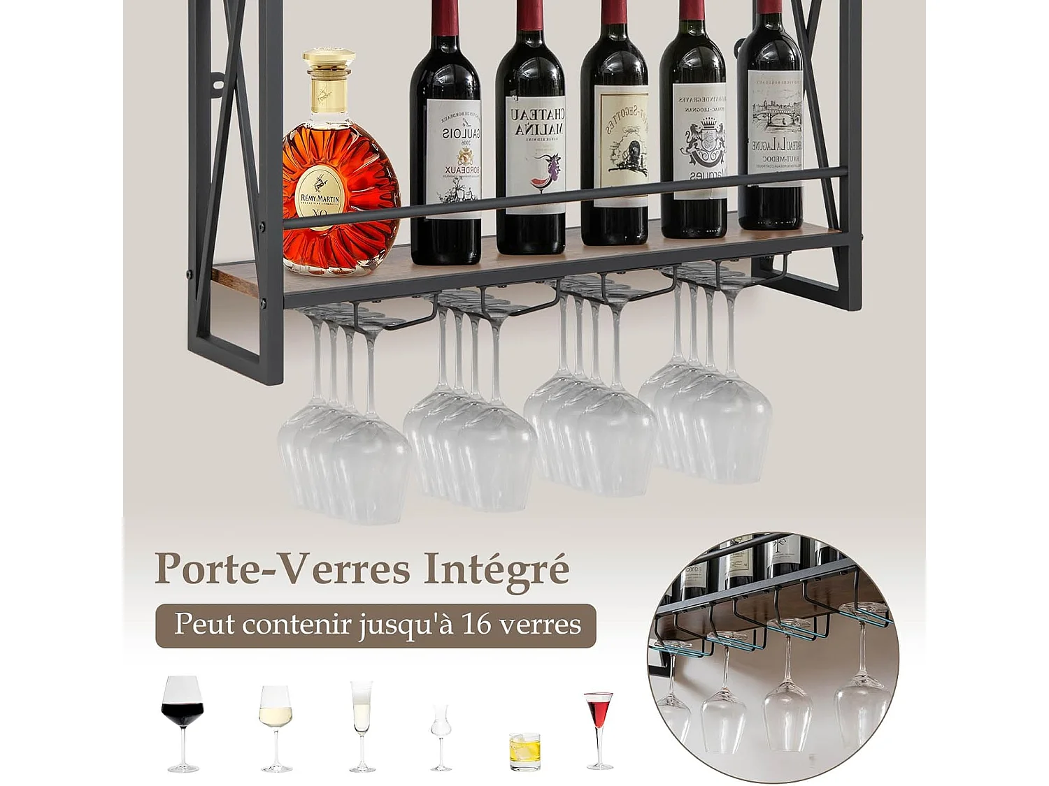 Porte-bouteilles mural industriel,porte-bouteilles 2 niveaux et 3 rangées de porte-verres