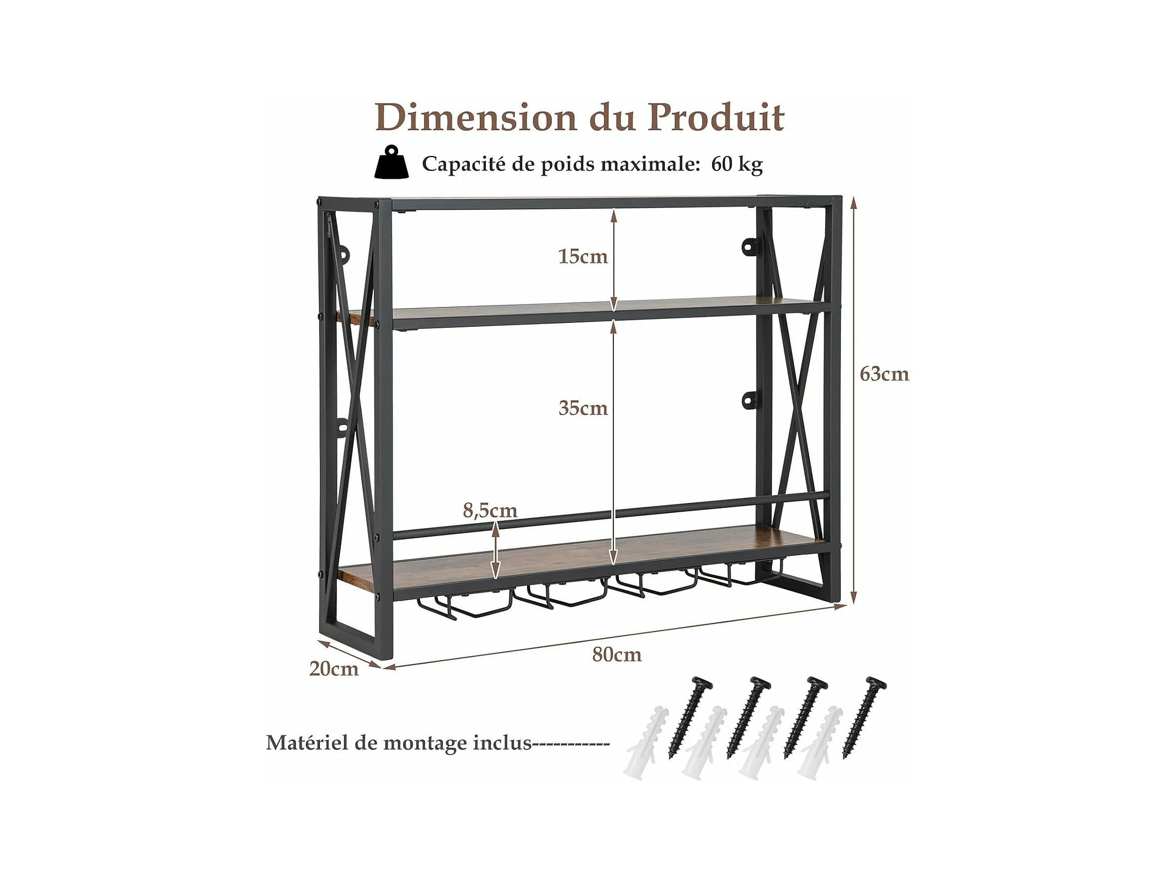Casier à bouteilles mural industriel, étagère de rangement à 3 niveaux, 20 x 80 x 63 cm