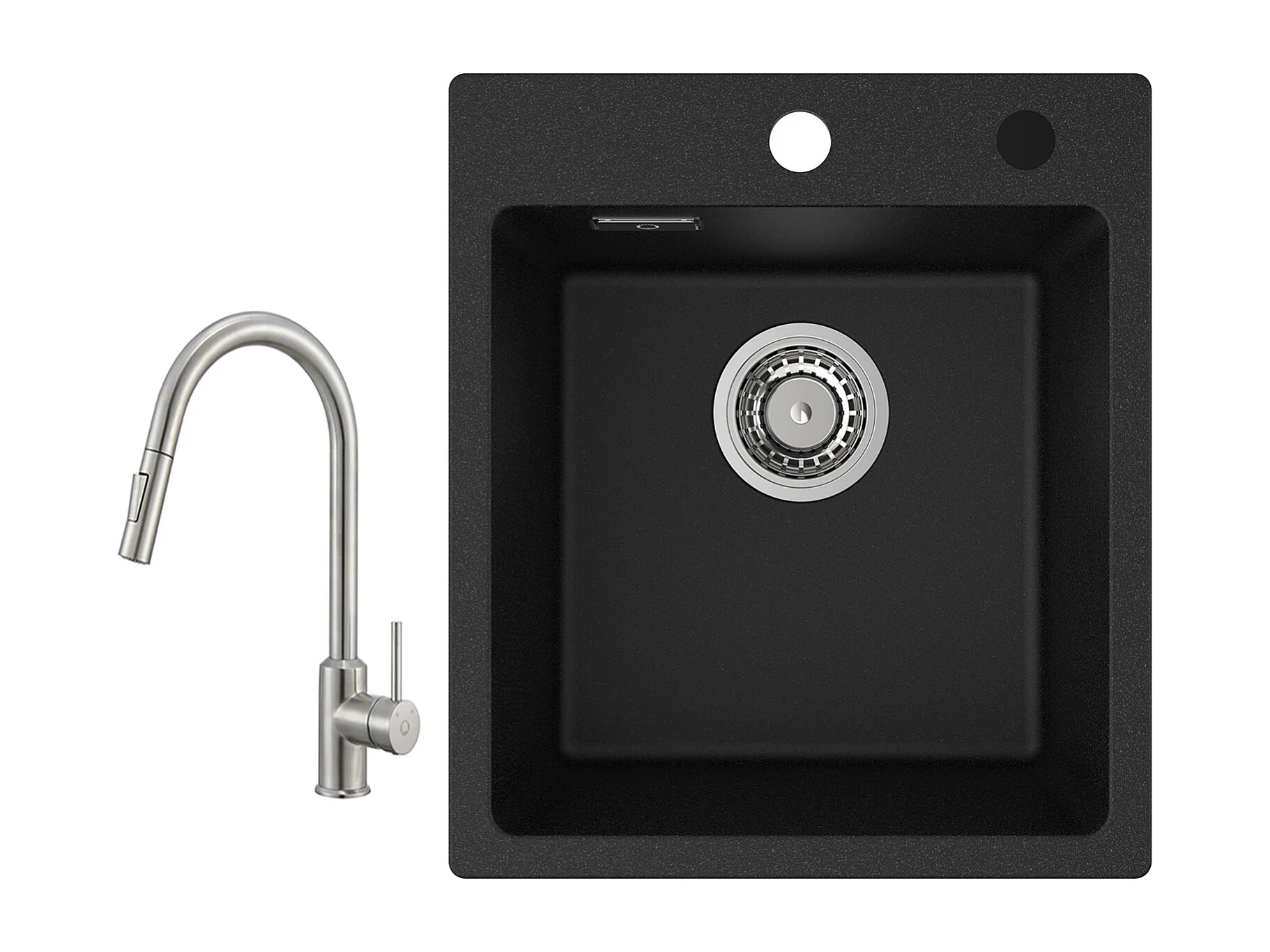 Evier de Cuisine en Quartz et Résine 40x45cm Evier Quartz 1 Bac Noir + Mitigeur de Cuisine Avec Douchette Extractible, 2 Modes de Sortie D'eau, Brossé