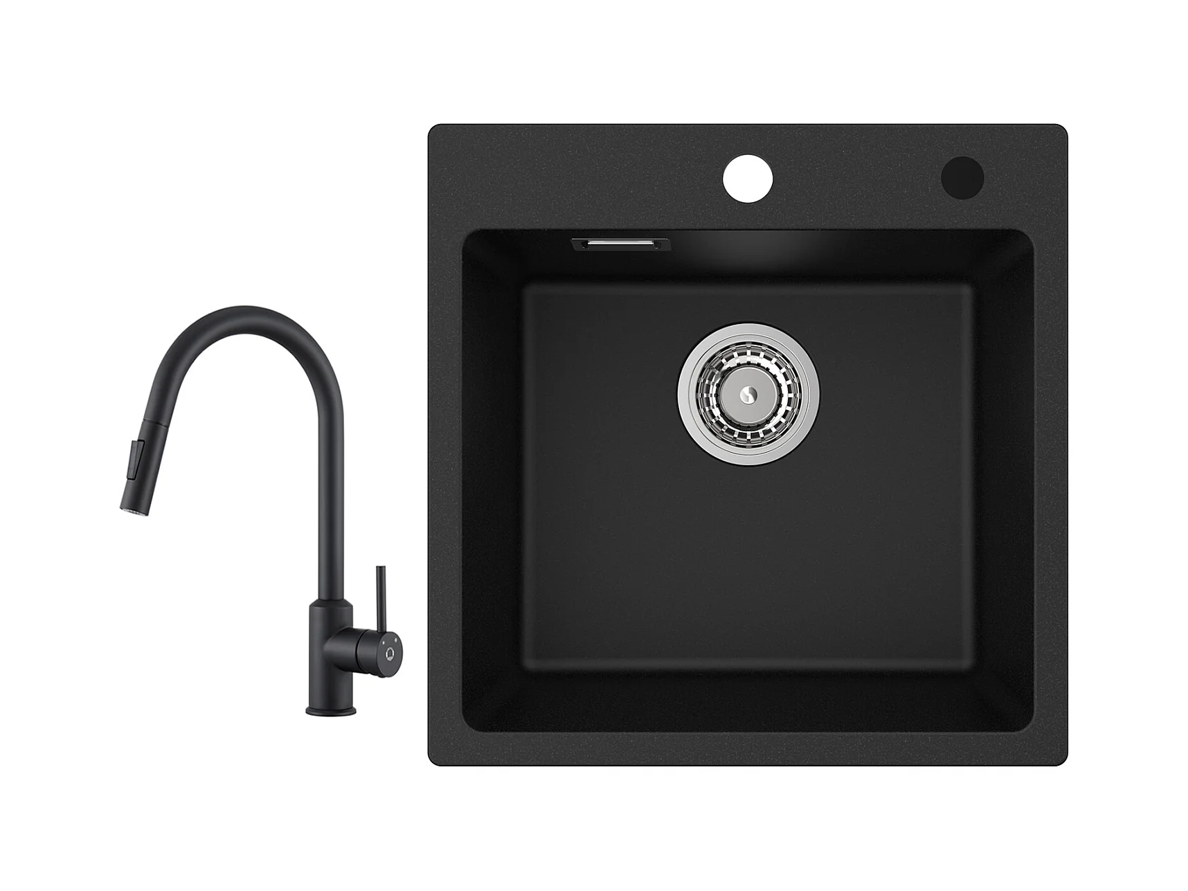 CECIPA MAX Evier Quartz Noir 45x45 cm Evier 1 Bac en Quartz et Résine + Mitigeur de Cuisine Avec Douchette Extractible, 2 Modes de Sortie D'eau, Noir
