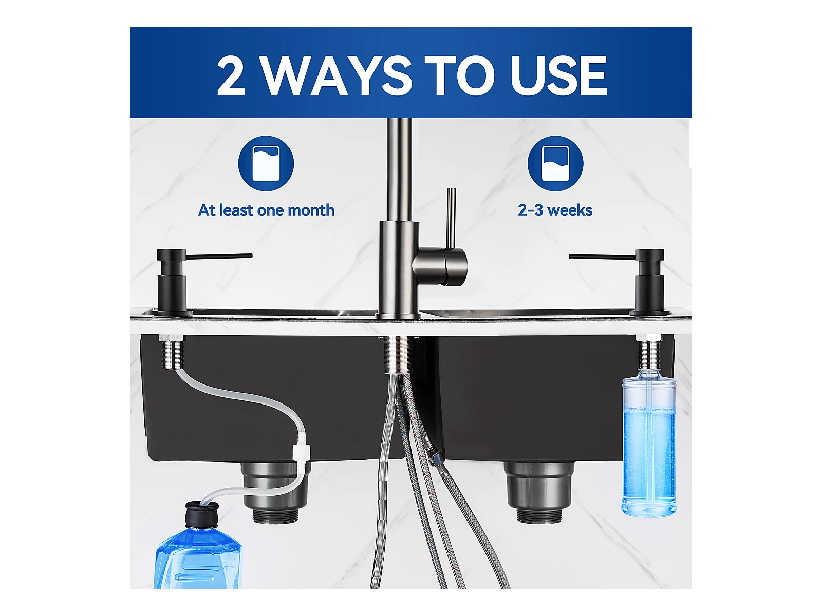 2PCS Distributeur de Savon de Cuisine avec Récipient de 300ML + Tuyau d'extension en Silicone de 1,25M - Distributeur de Savon pour Evier Noir