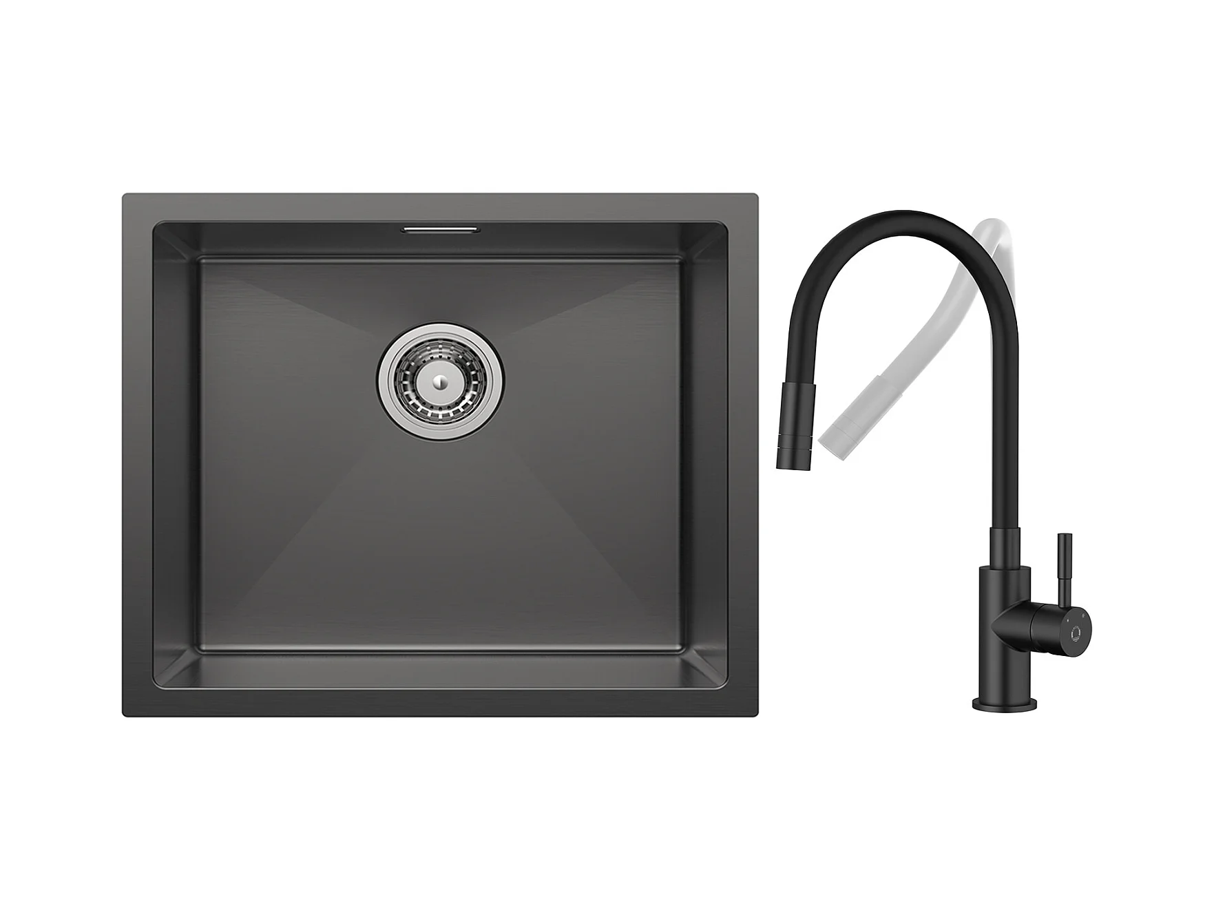 CECIPA MAX Évier 1 Bac 50*44cm Évier de Cuisine en Inox Noir Anthracite + Flexible Mitigeur de Cuisine, 2 Types de Jets Robinet Extractible Brossé