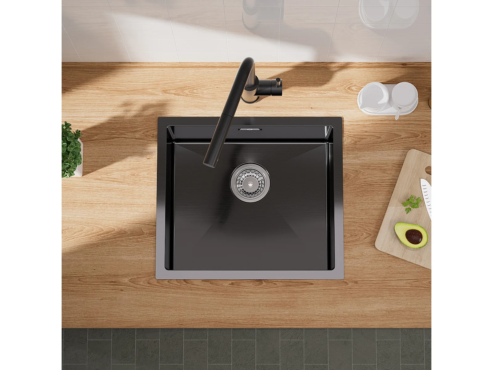 Cecipa max Évier 1 Bac 50*44cm Évier de Cuisine en Inox Noir Anthracite + Mitigeur avec Douchette Extractible - Avec 3 Modes de Sortie D'eau - Brossé