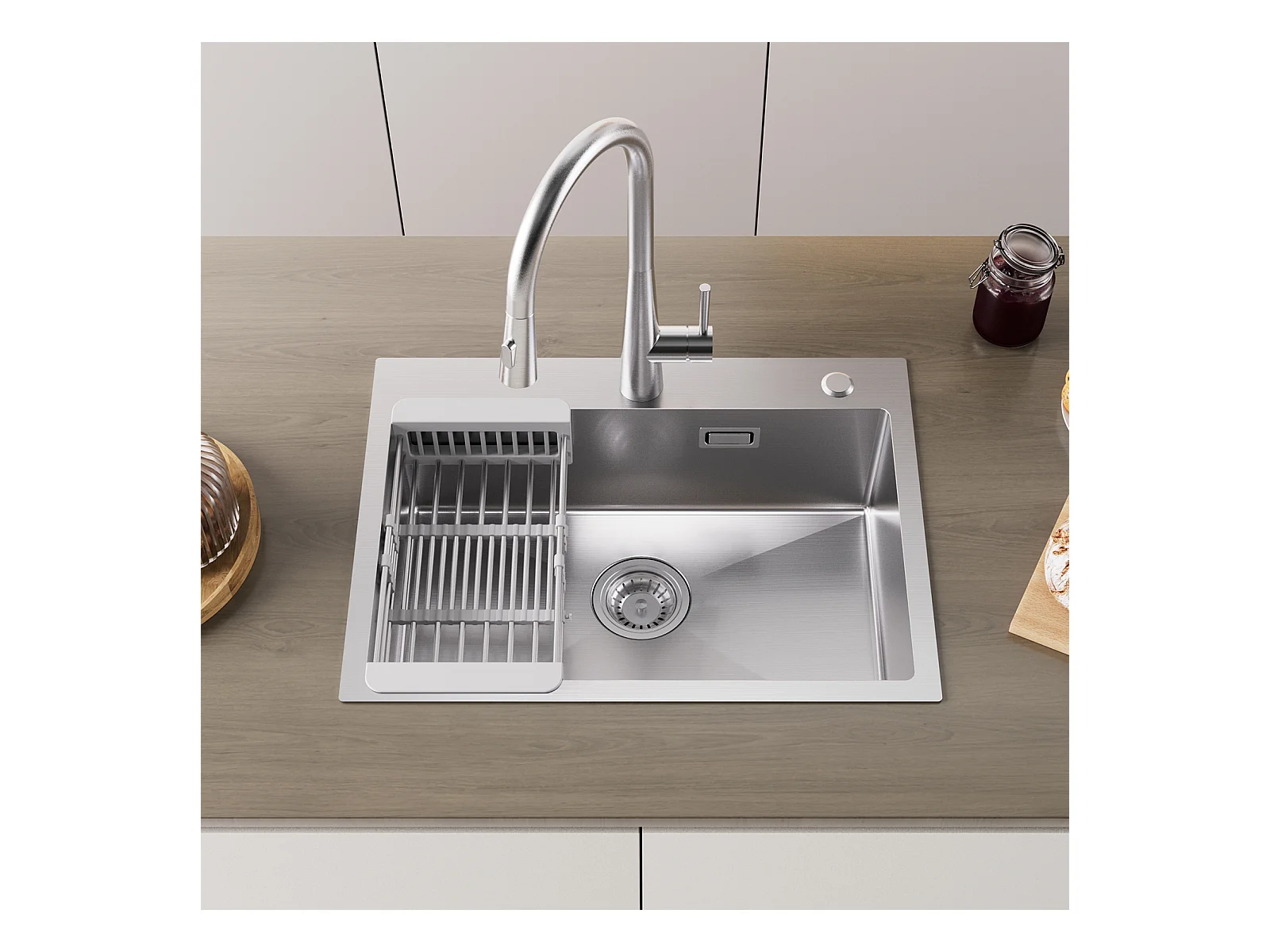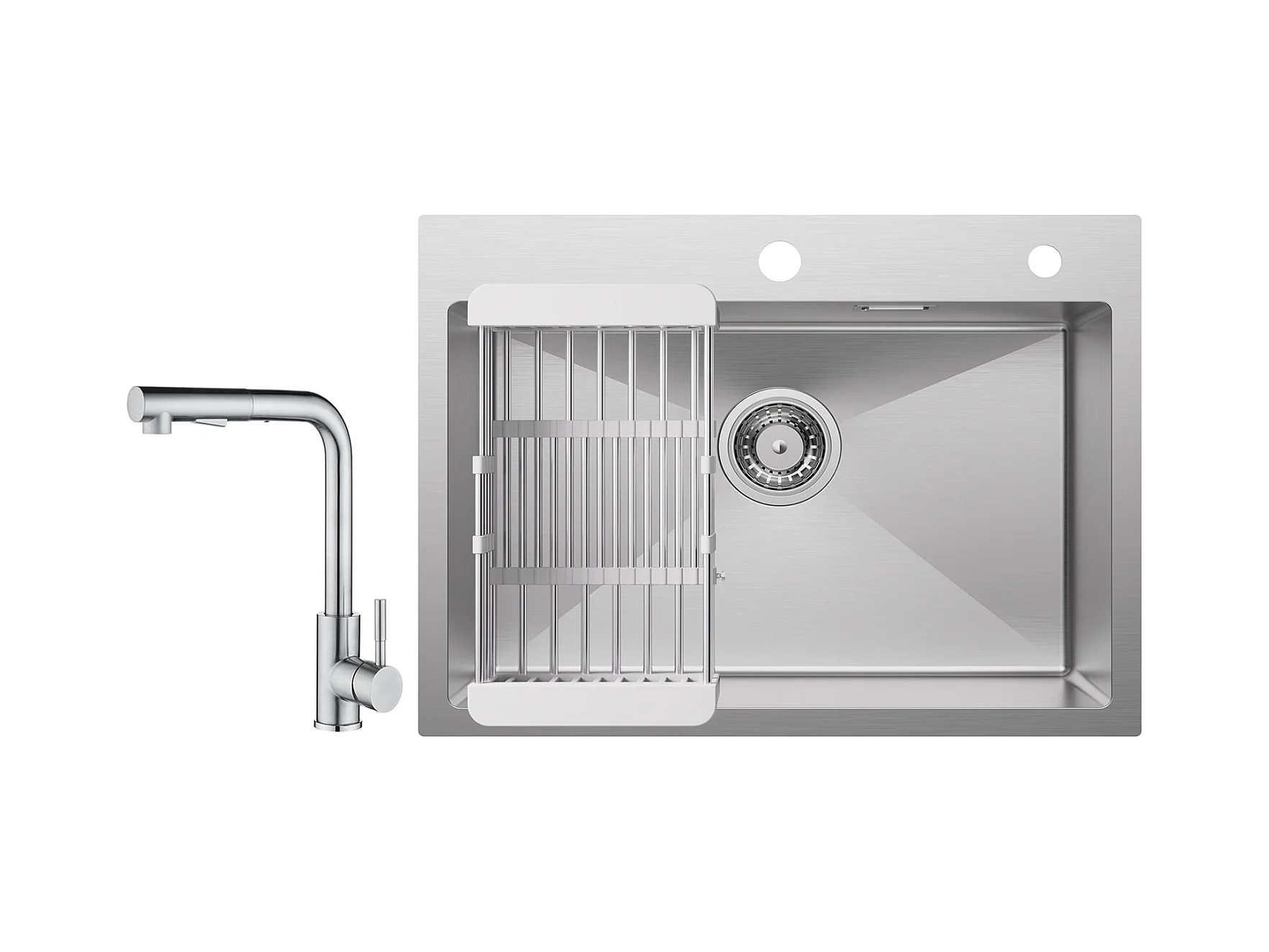 Cecipa max Évier 1 Bac 60×45cm Évier Inox Brossé avec Panier de Drainage + Mitigeur de Cuisine à Ressort avec 3 Modes de Sortie D'eau, Brossé