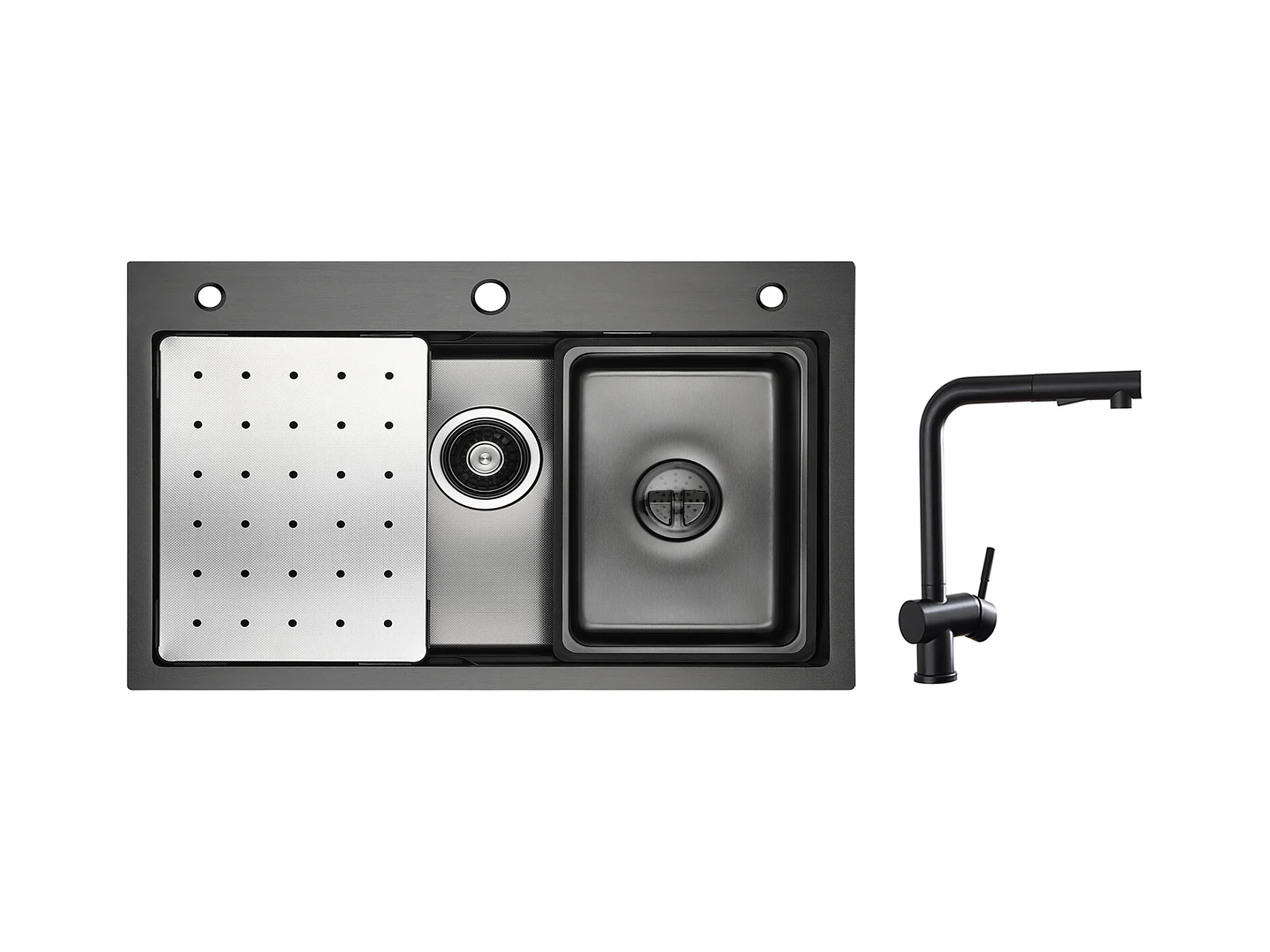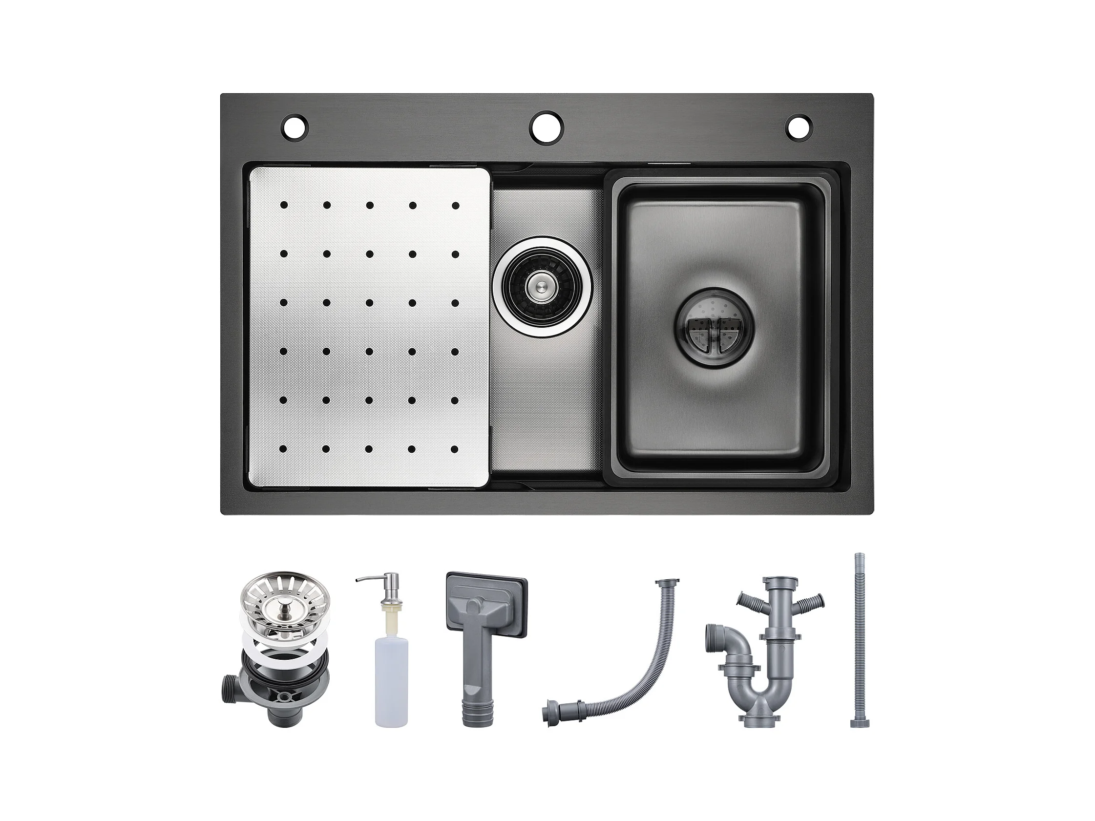Évier de Cuisine 1 Cuve 70×45×21.5 cm + Egouttoir + Vasque + Distributeur de Savon + Mitigeur Evier à 3 Voies, 2 Leviers, Noir