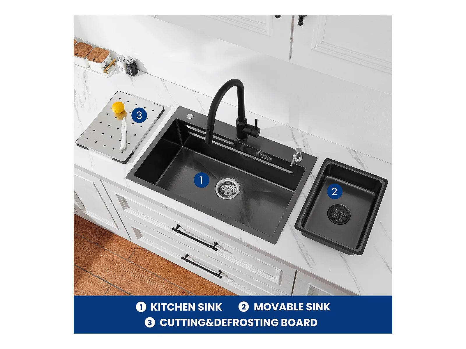 Évier de Cuisine 1 Cuve 70×45×21.5 cm + Egouttoir + Vasque + Distributeur de Savon + Mitigeur de Cuisine Rabattable Noir