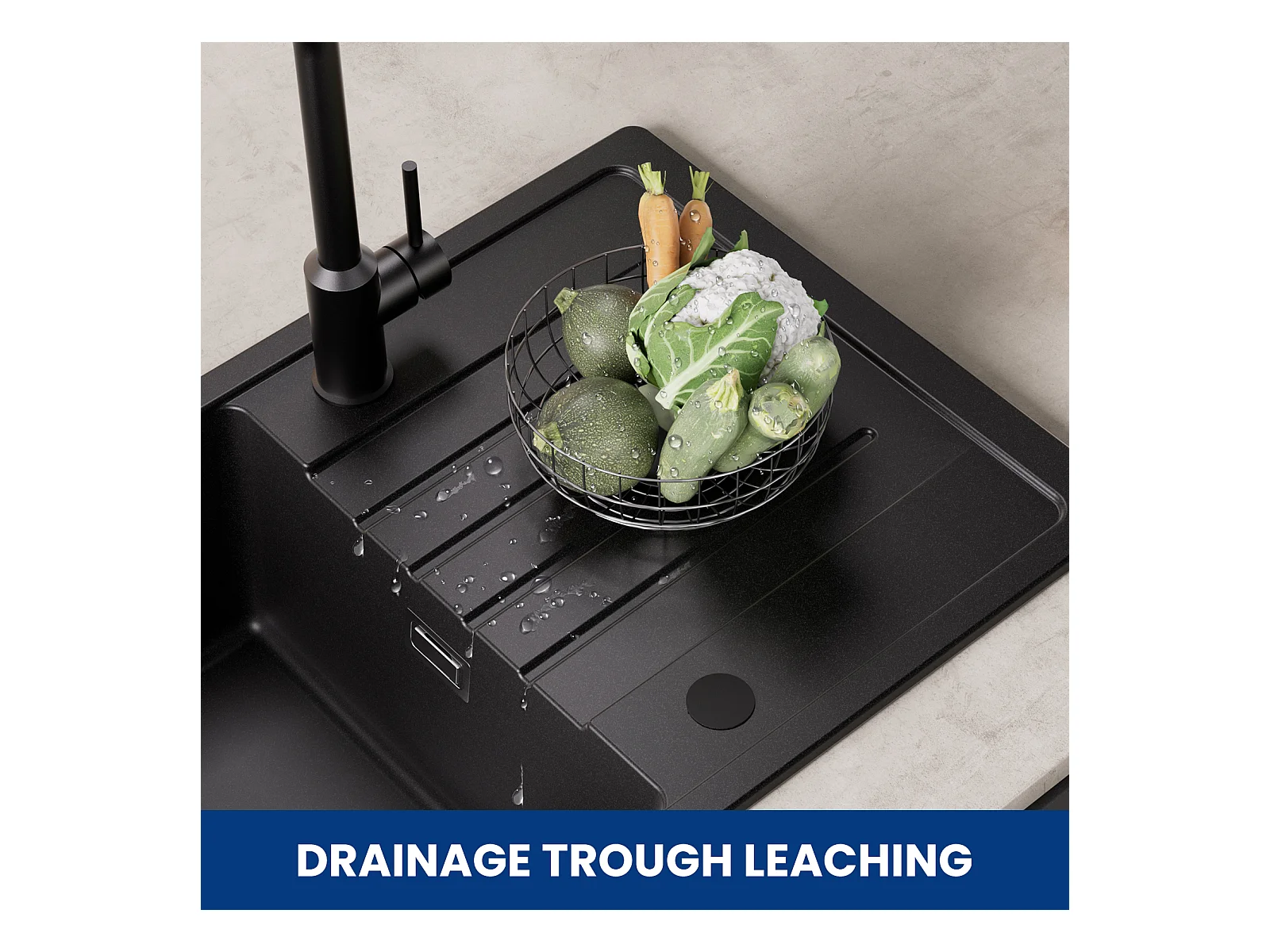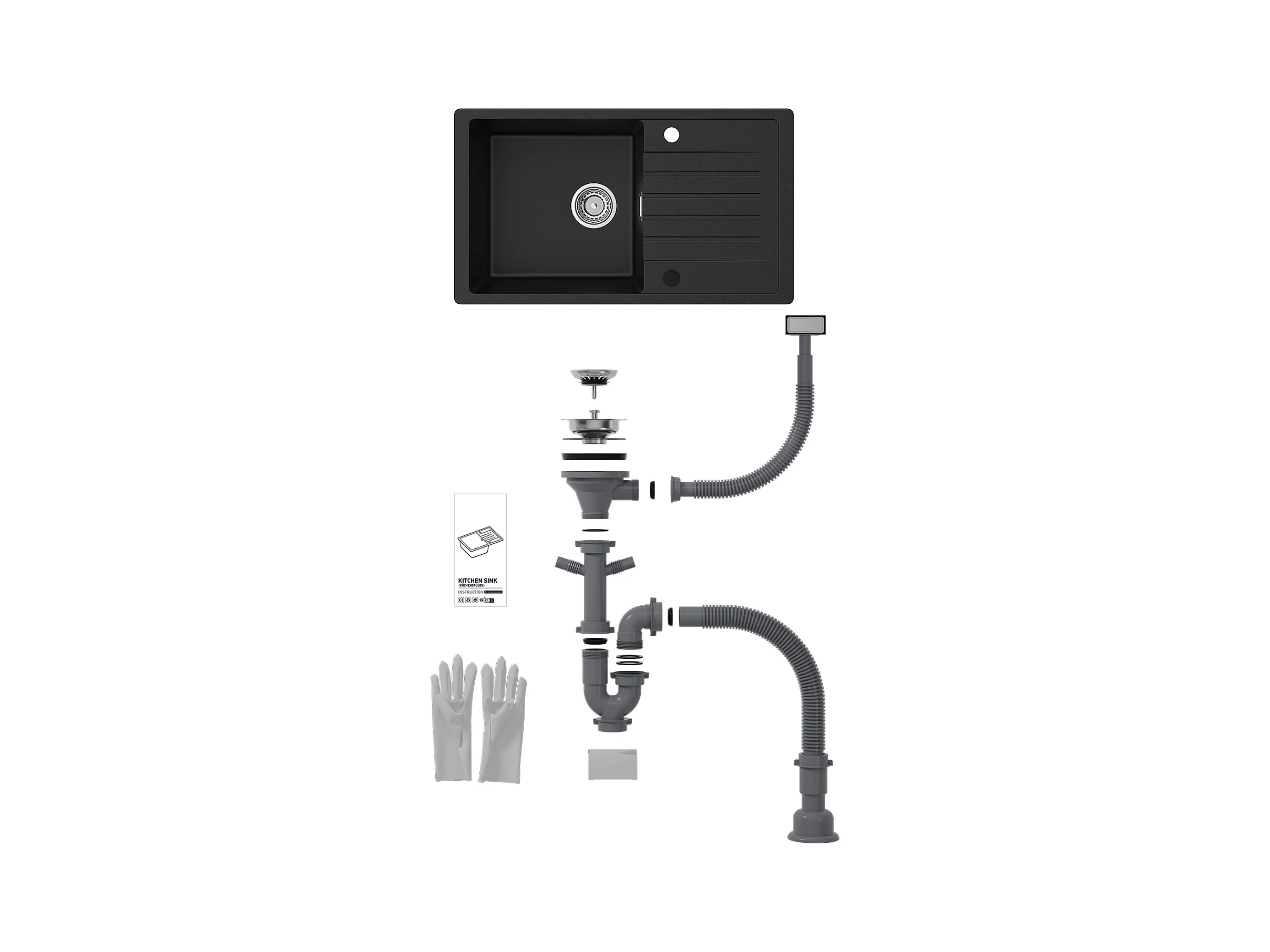 Evier 1 Bac en Quartz et Résine - Noir Evier avec Egouttoir 78x45cm + Mitigeur avec Douchette Extractible, Noir