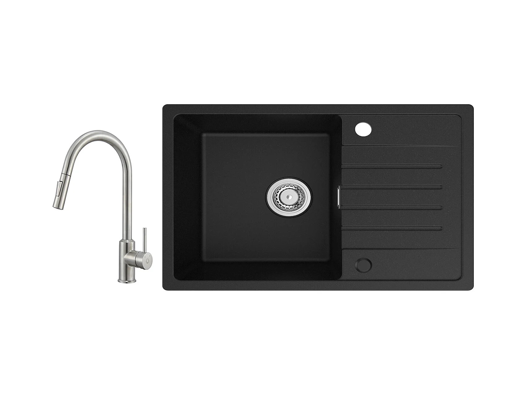 Cecipa max Evier 1 Bac 78x45cm avec Egouttoir Evier à encastrer Quartz et résine Noir + Mitigeur avec Douchette Extractible - 2 Jets aux Choix Brossé