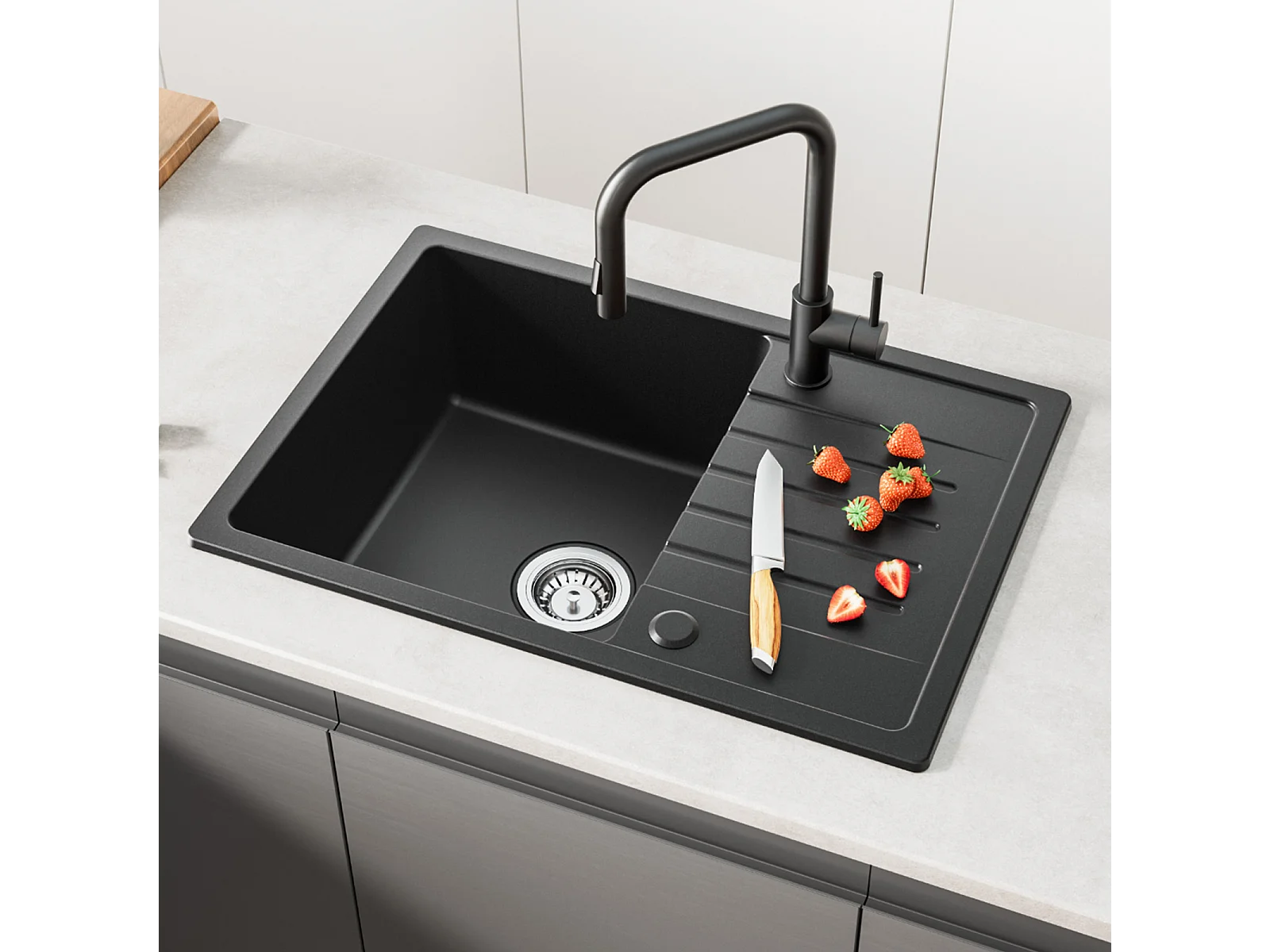 Cecipa max Evier 1 bac avec égouttoir - Evier à encastrer Quartz et résine - Evier de Cuisine avec étagère Noir (65 x 45 cm),EU Modèle