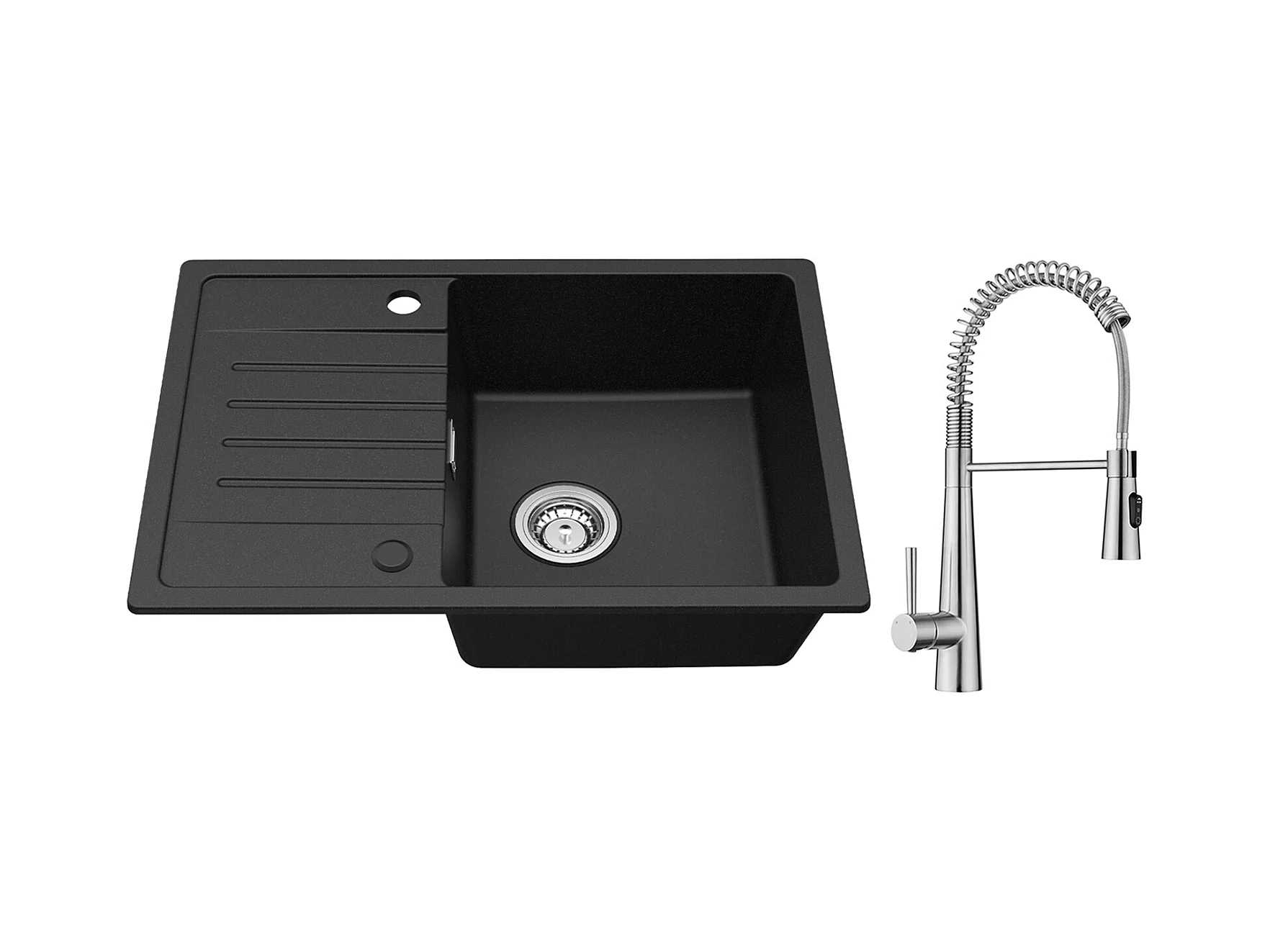 Noir Evier à Encastrer 1 Bac avec Egouttoir, Quartz et Résine, 65x45cm + Mitigeur avec Douchette Extractible, Noir
