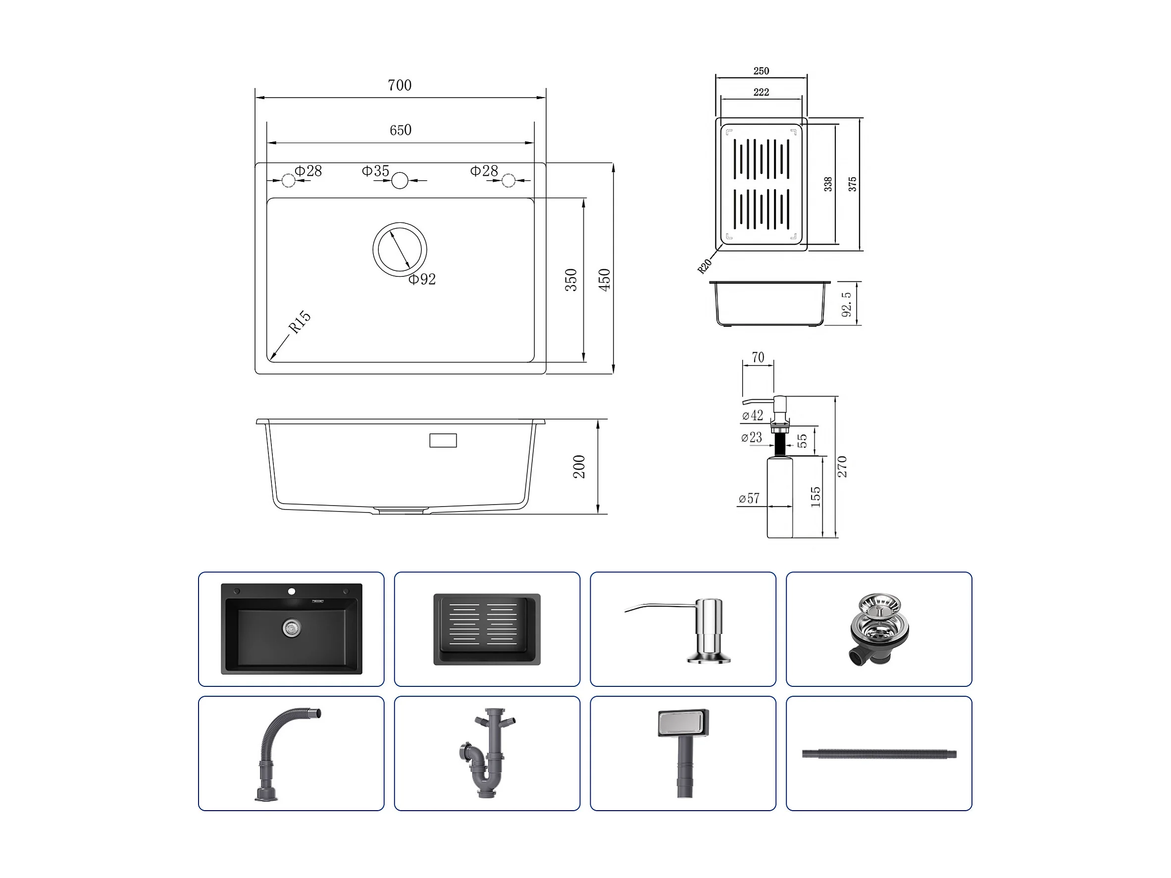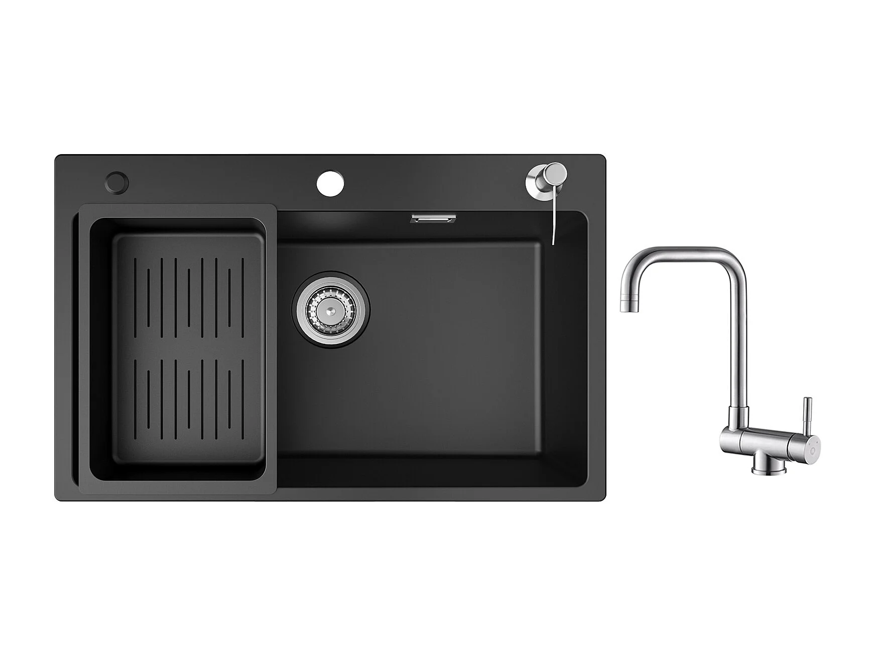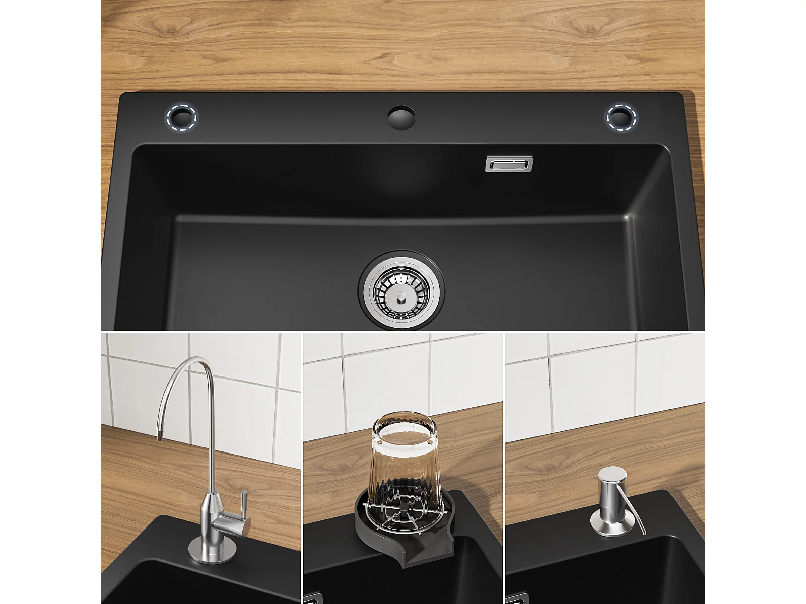 Cecipa max Evier 1 Bac en Quartz avec Panier de Vidange et Distributeur de Savon 70x45cm + Robinet Rabattable Mitigeur de Evier Repliable Brossé