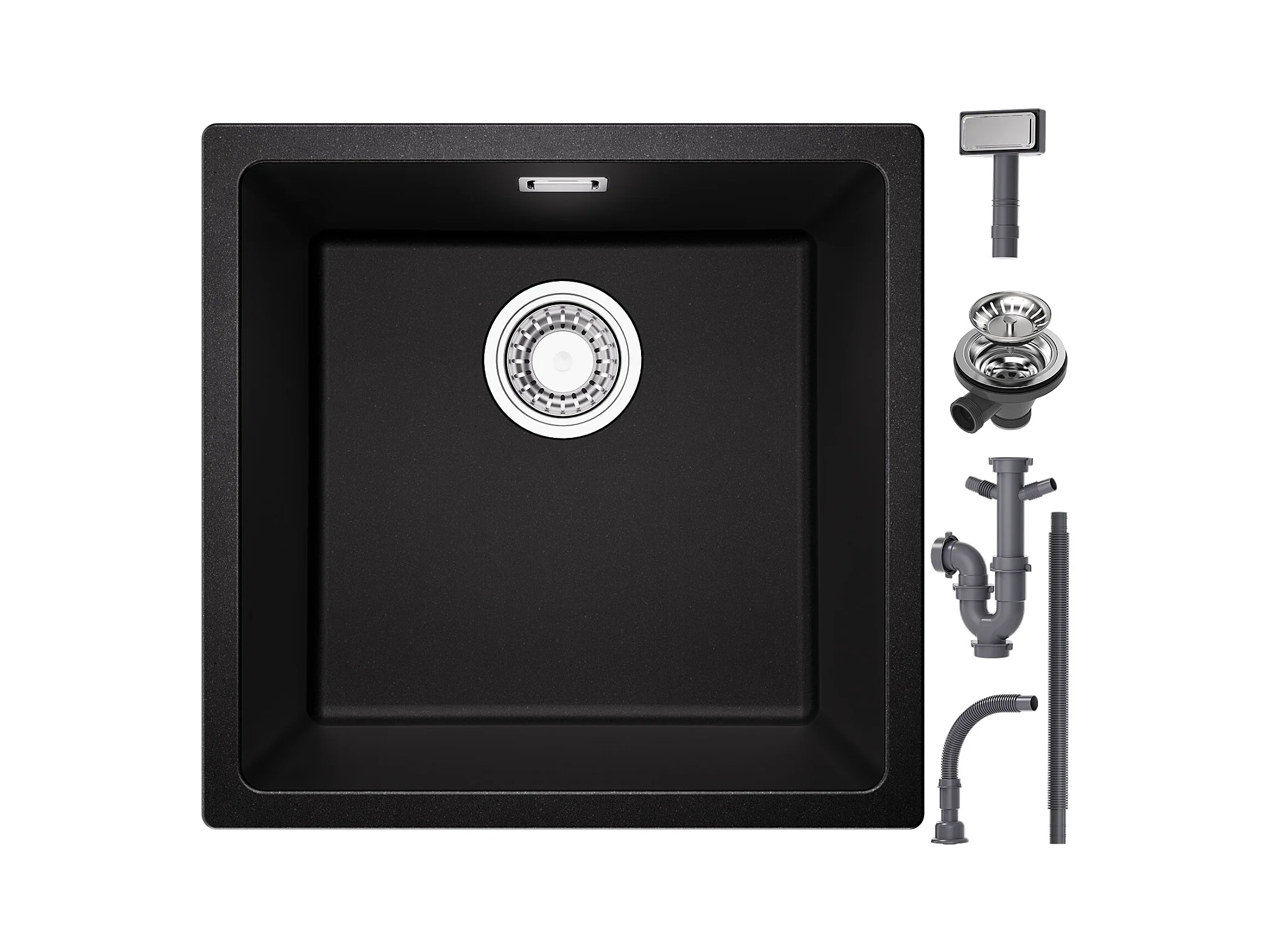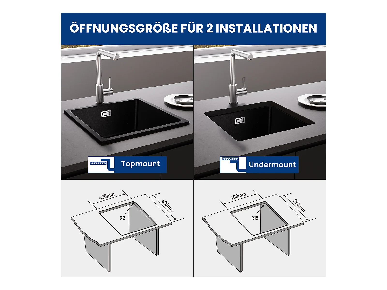 Evier 1 Bac en Quartz et Résine, 3 Options de Montage, 45*44*20cm + Mitigeur de Cuisine en Inox Noir