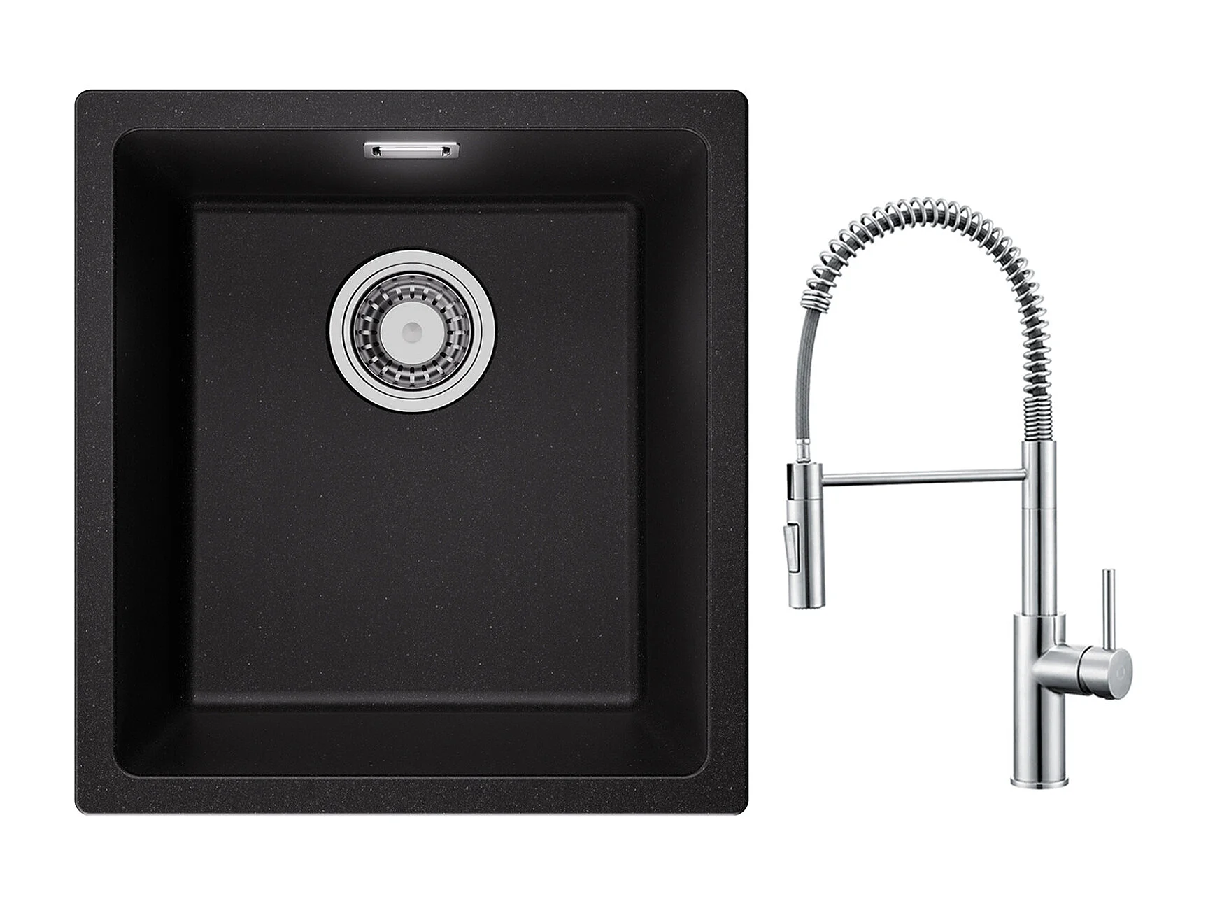 Evier 1 Bac en Quartz et Résine, 3 Options de Montage, 40*44*20cm + Mitigeur avec Douchette Extractible, Noir