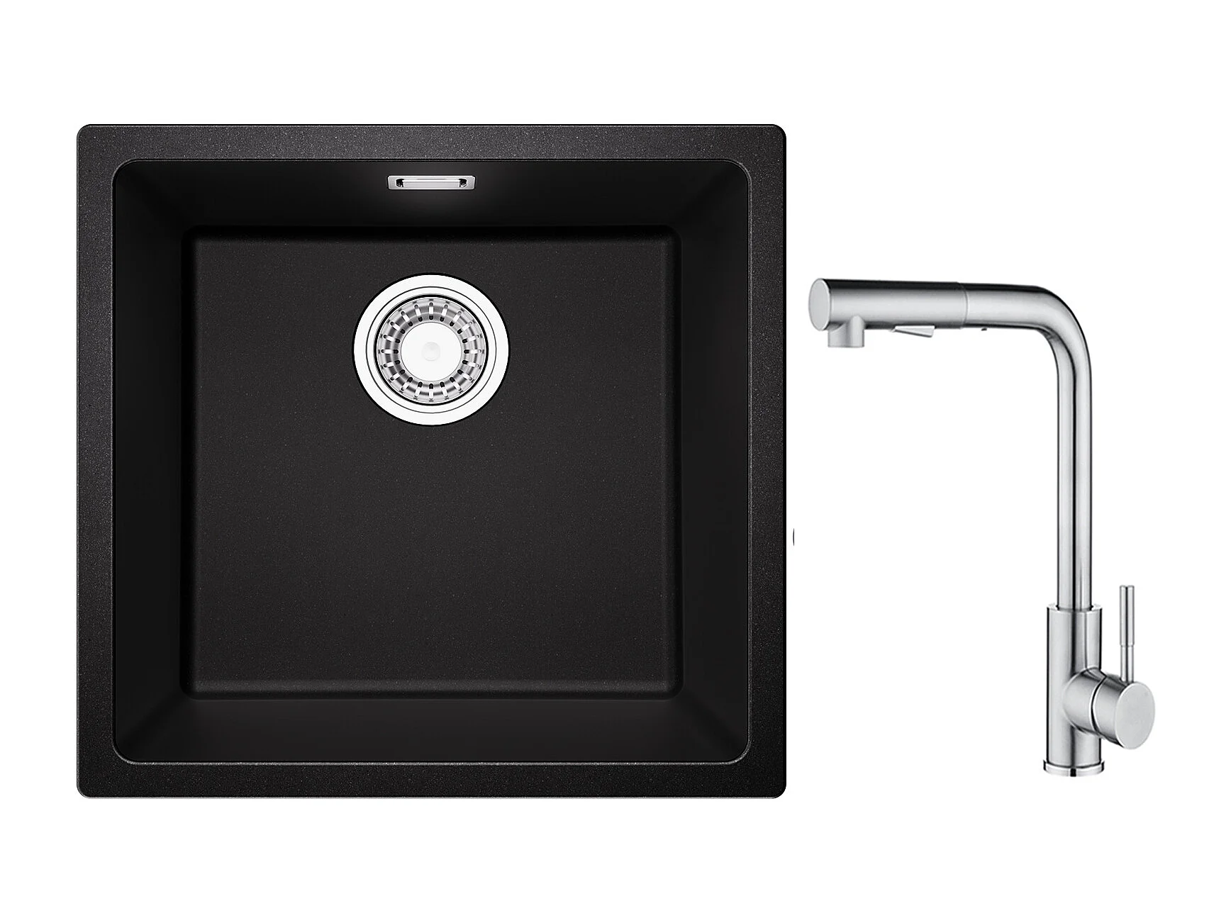 Evier 1 Bac en Quartz et Résine, 3 Options de Montage, 45*44*20cm + Mitigeur de Cuisine Rabattable Noir