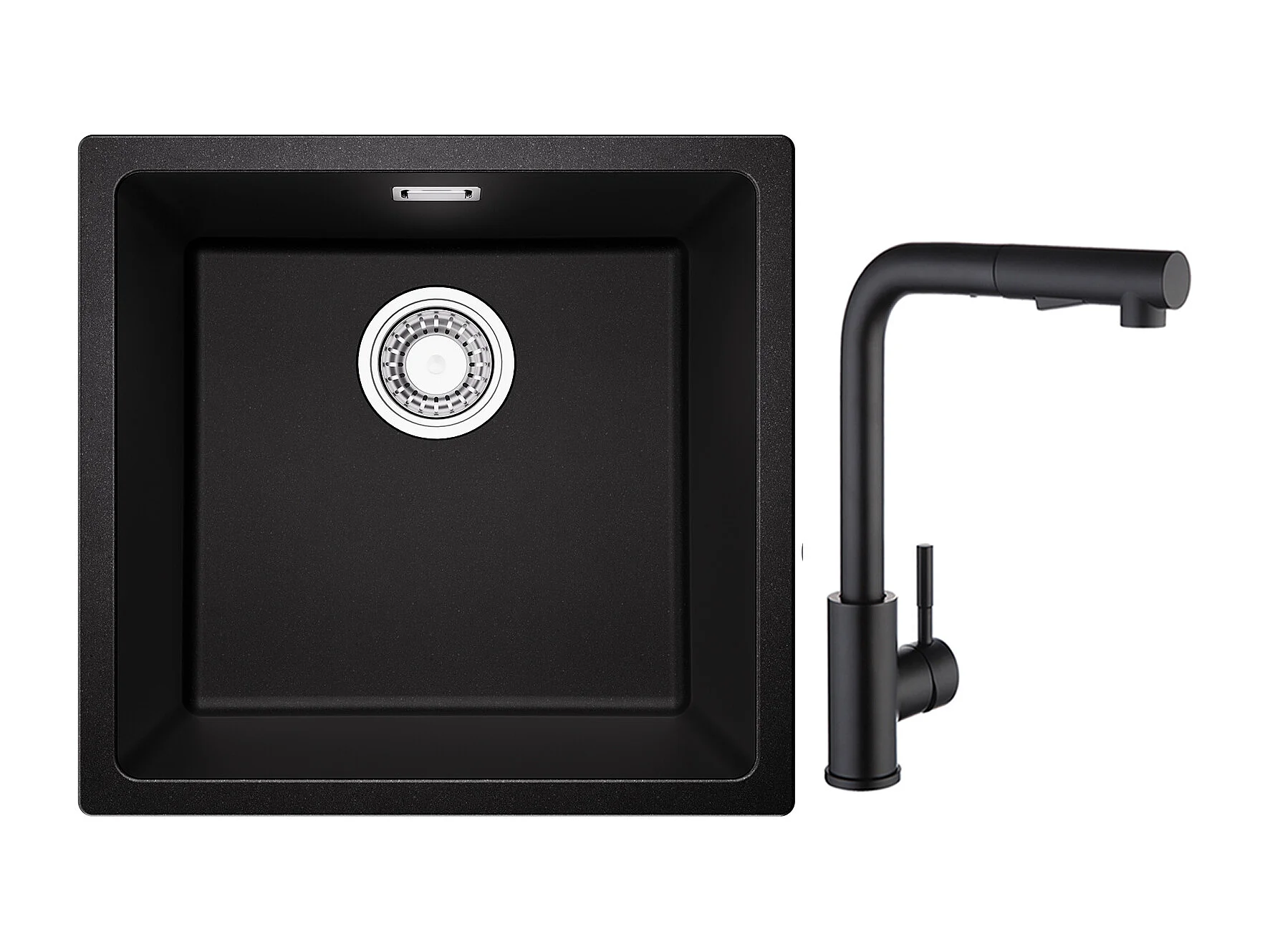Evier 1 Bac en Quartz et Résine, 3 Options de Montage, 45*44*20cm + Mitigeur de Cuisine Rabattable Noir