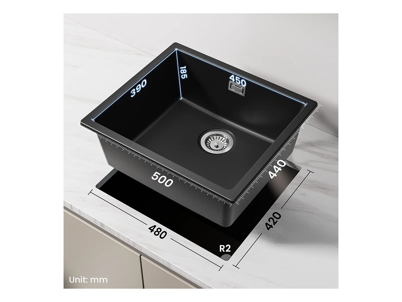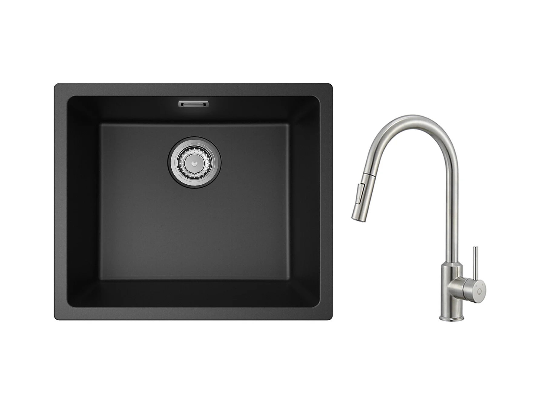 Evier 1 Bac en Quartz et Résine, 3 Options de Montage, 50*44*20cm + Robinet de Cuisine à eau Froide,Noir