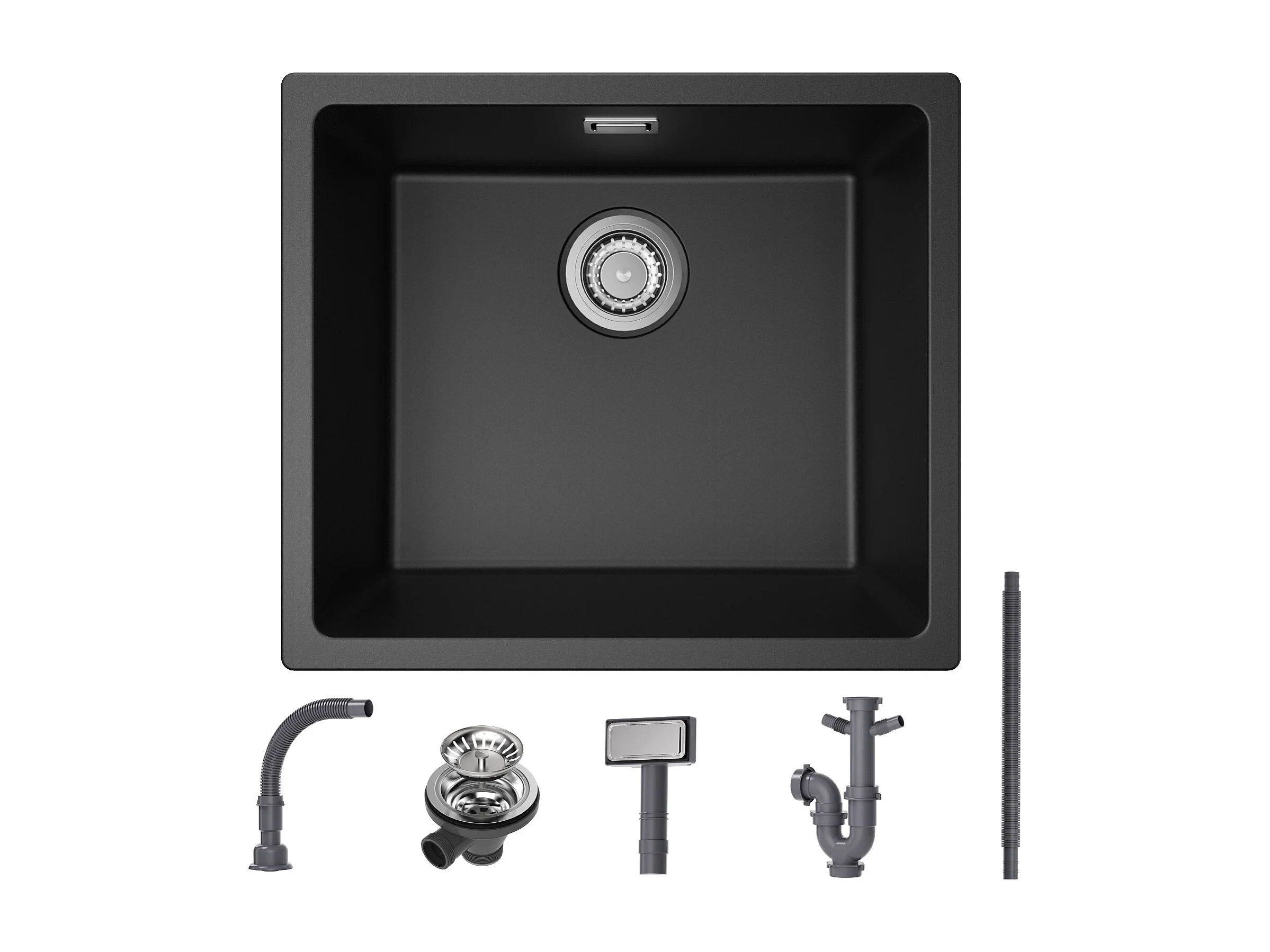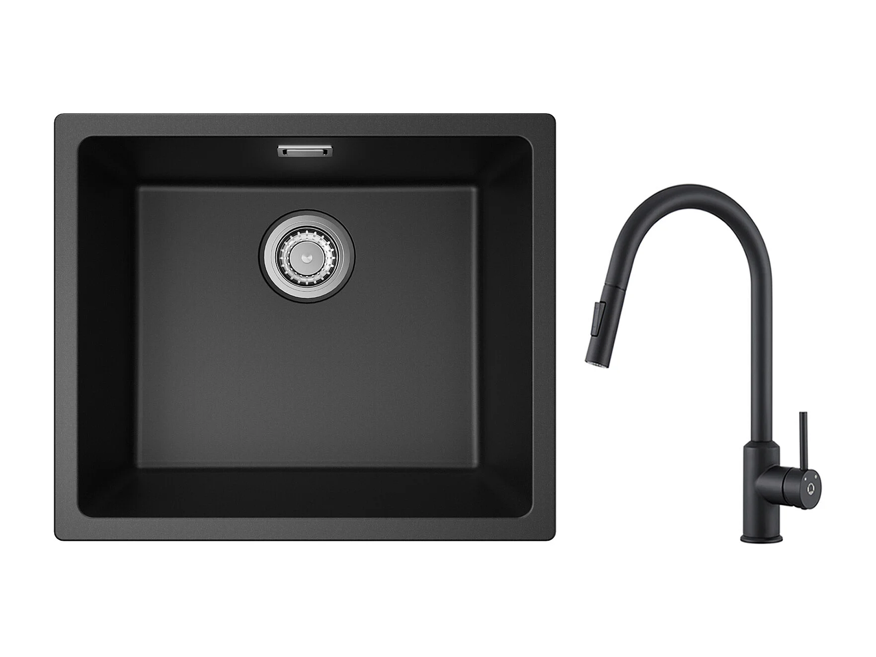 Evier 1 Bac en Quartz et Résine, 3 Options de Montage, 50*44*20cm + Mitigeur avec Douchette Extractible, Noir