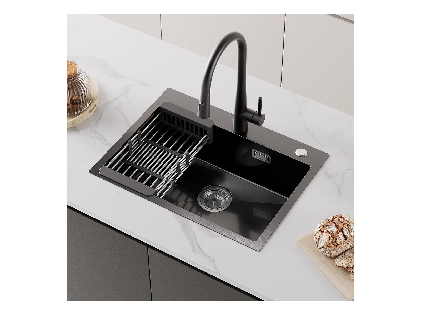 Évier Cuisine 1 Bac 60×45×18CM Évier Inox Noir avec Panier de Drainage + Mitigeur de Evier Noir Rrotatif à 360 °
