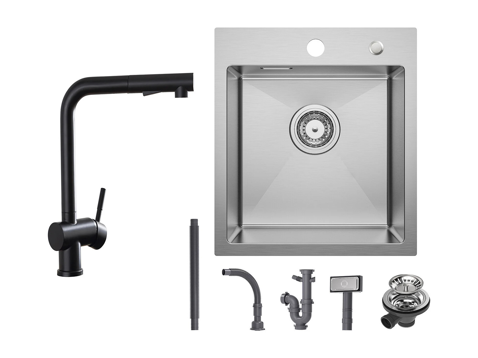 Évier de Cuisine 1 Bac 40 × 45 cm Évier Inox Évier Encastré Brossé + Mitigeur de Cuisine Avec Douchette Extractible, 2 Modes de Sortie D'eau, Noir