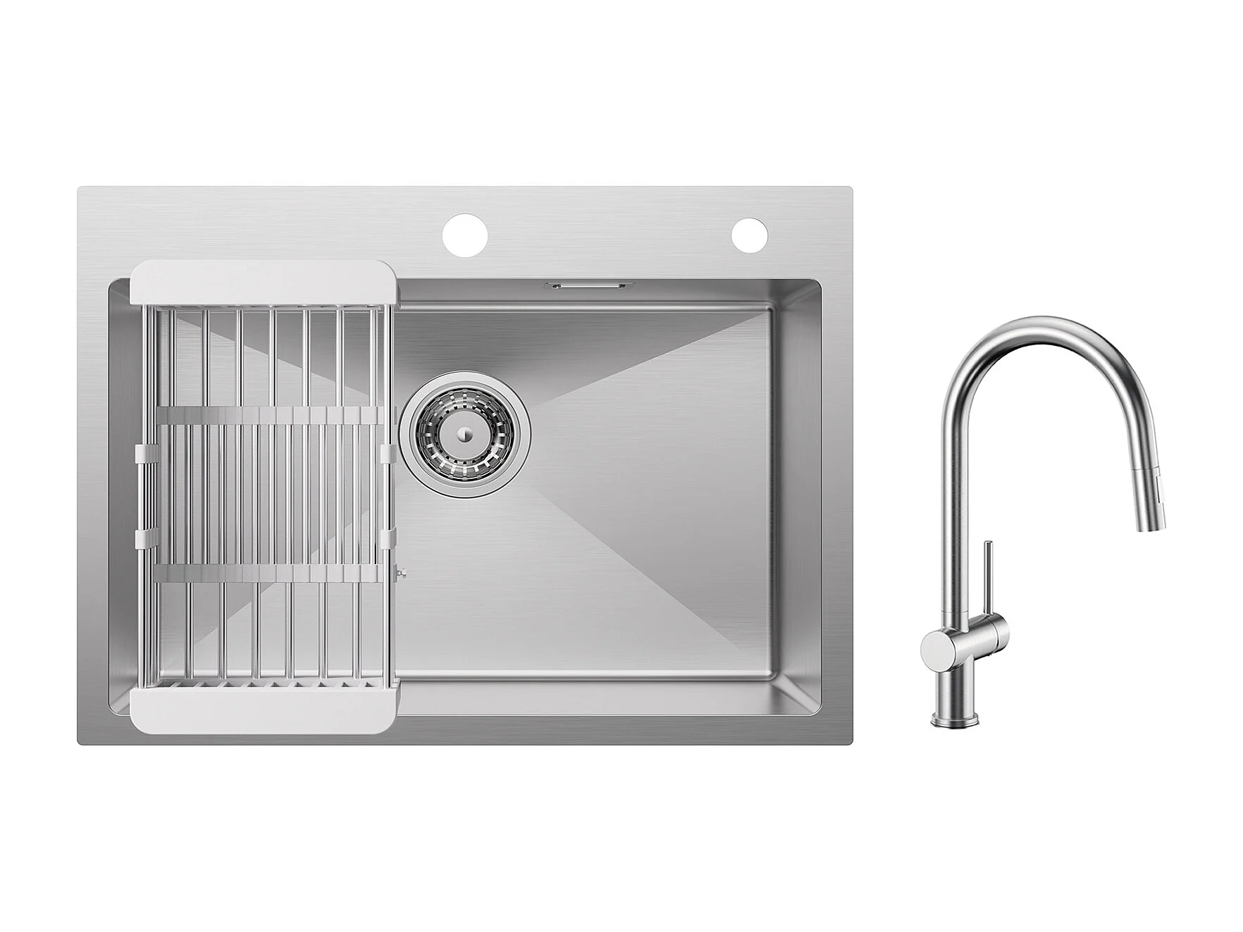 Évier 1 Bac 60×45cm Évier Inox Brossé avec Panier de Drainage + Mitigeur de Cuisine Avec Douchette Extractible, 2 Modes de Sortie D'eau, Brossé