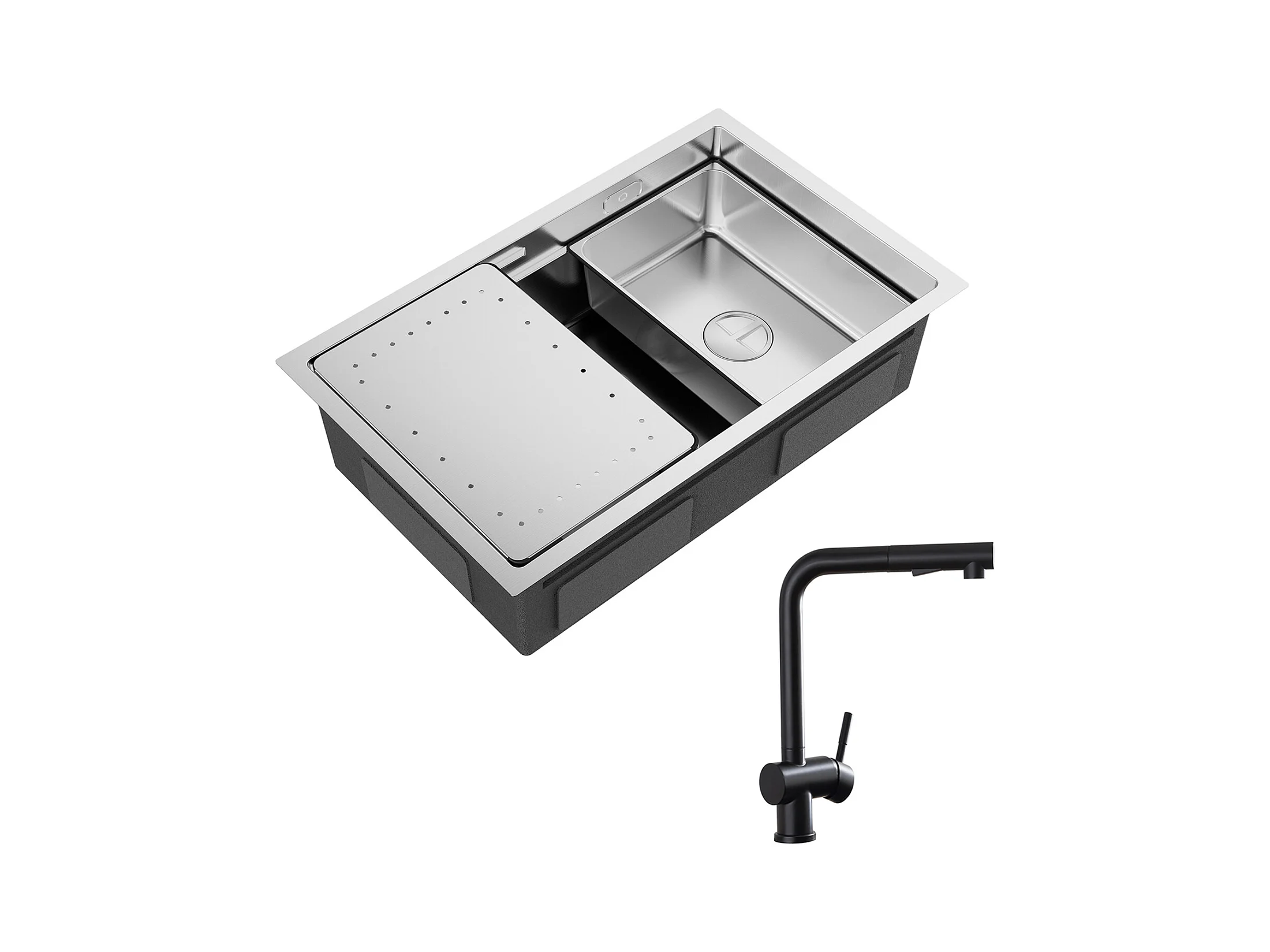 CECIPA MAX Évier 1 Bac 70×44cm Évier Brossé avec Egouttoir et Vasque + Mitigeur de Cuisine Avec Douchette Extractible, 2 Modes de Sortie D'eau, Noir