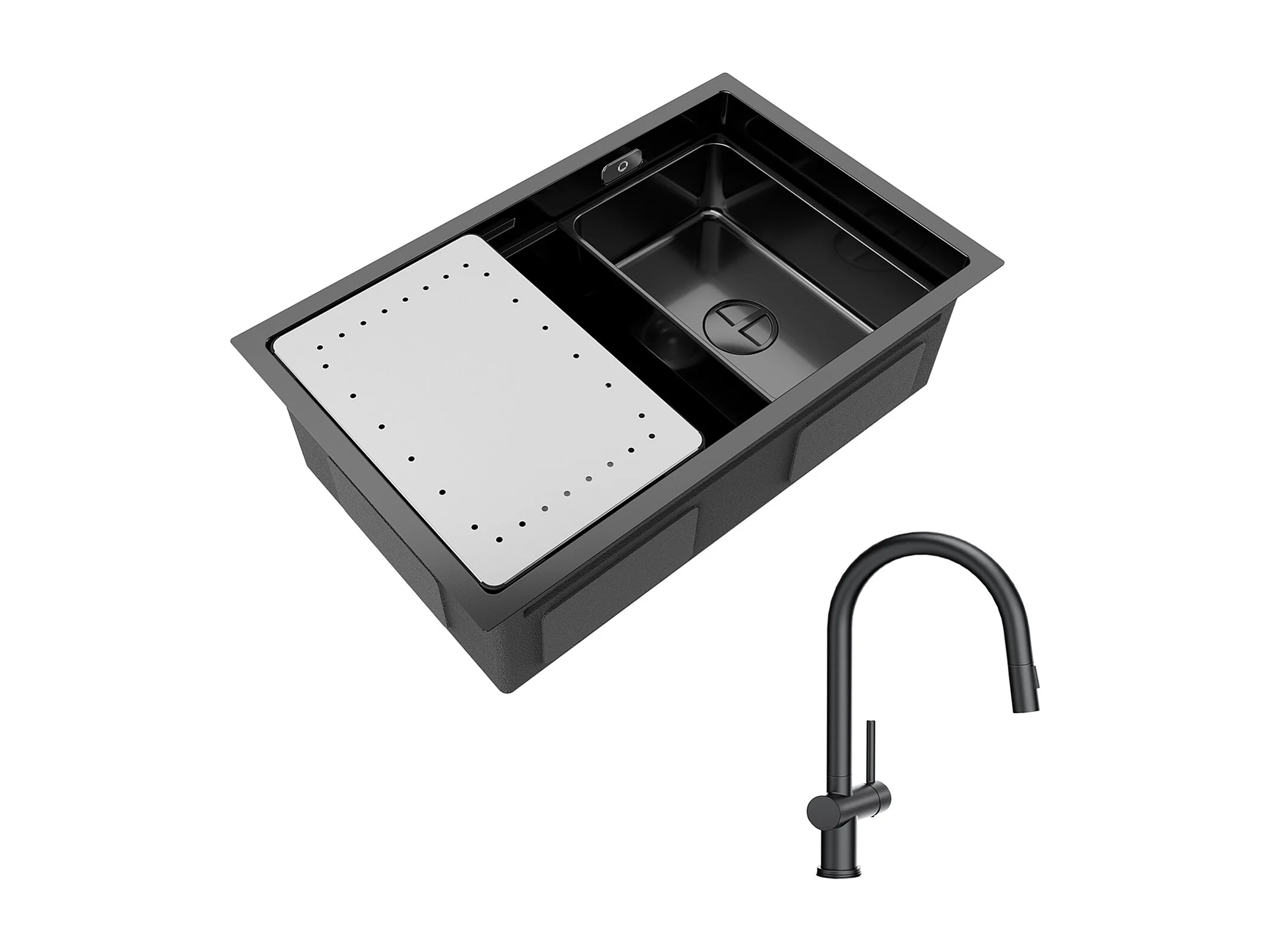 CECIPA MAX Évier 1 Bac 70×44CM Évier Noir avec Egouttoir et Vasque + Flexible Mitigeur de Cuisine, 2 Types de Jets Robinet Extractible Noir