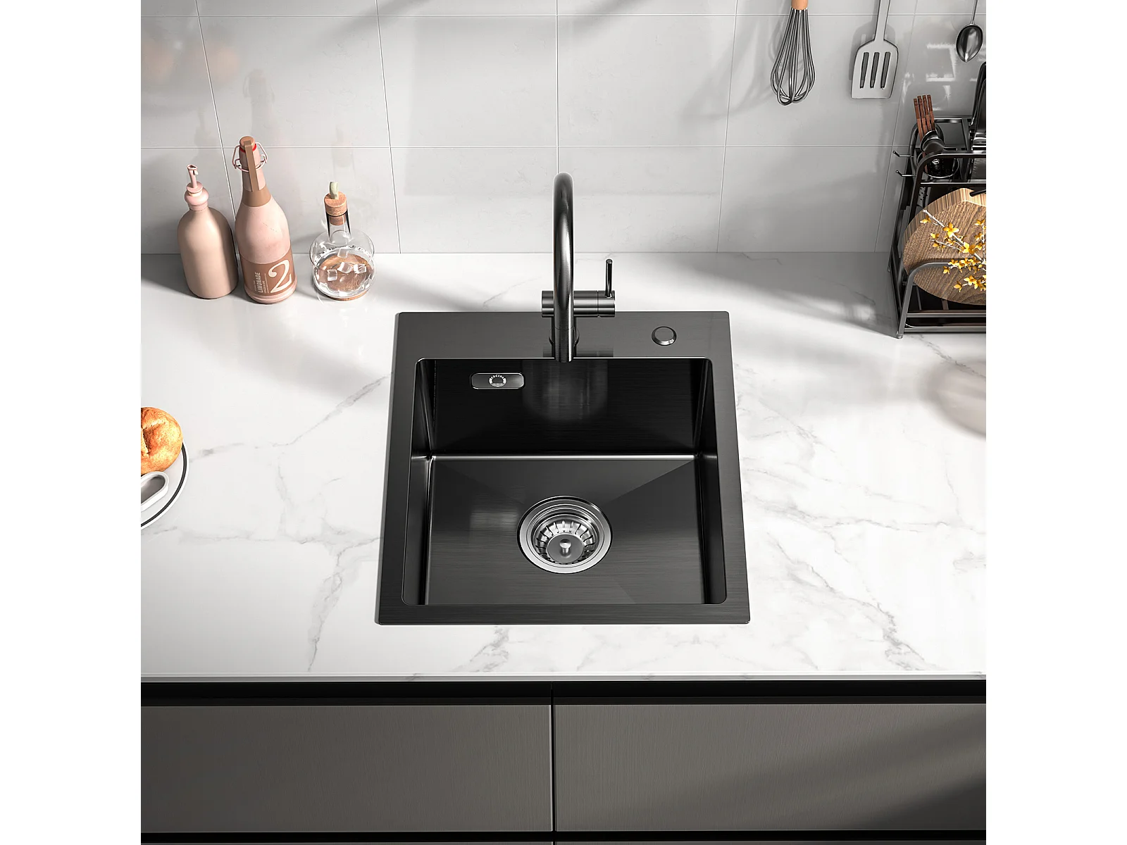 Evier Cuisine 1 Bac Noir Anthracite 40*45*19CM - Évier Inox Évier de Cuisine + Mitigeur de Cuisine en Inox Noir
