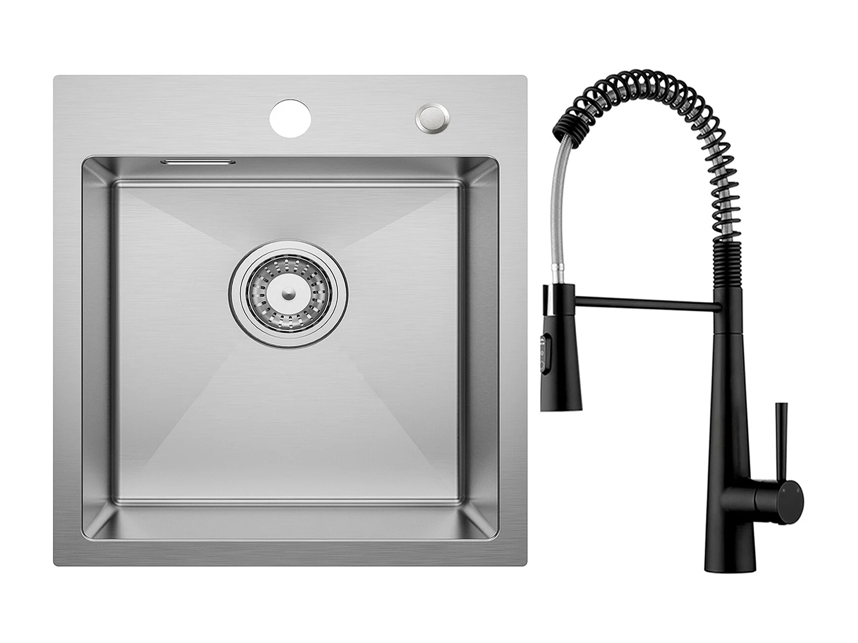 Cecipa max Évier de Cuisine 1 Bac 40 × 45 cm Évier Inox Évier Encastré Brossé + Mitigeur de Cuisine à Ressort Noir avec Douchette Extractible