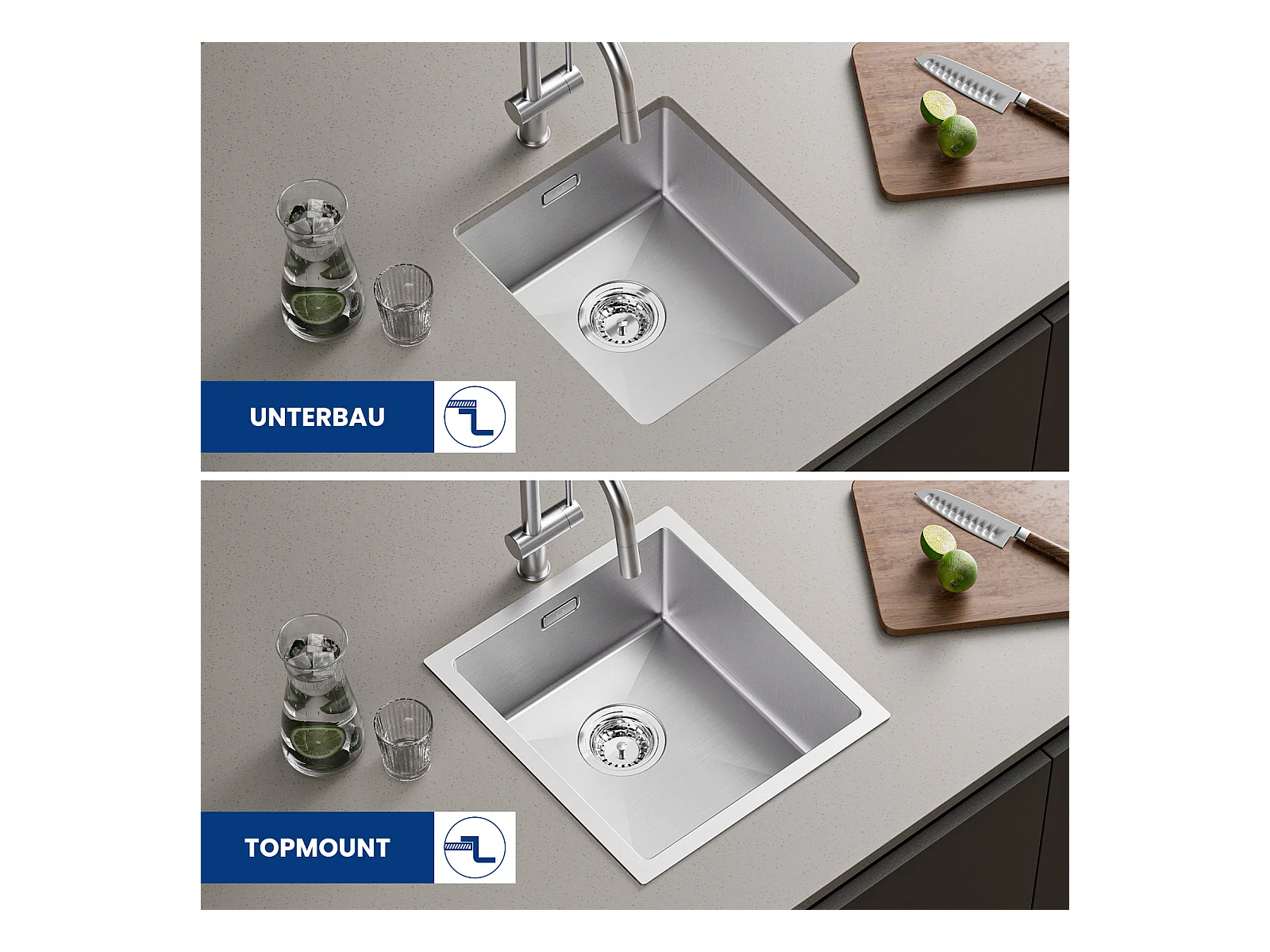 Cecipa MAX Évier Cuisine 1 Bac 40 × 45 cm Évier Inox 304 Montage à Encastrer ou à Fleur de Plan Au Moins 40 cm du Bas de l'Armoire