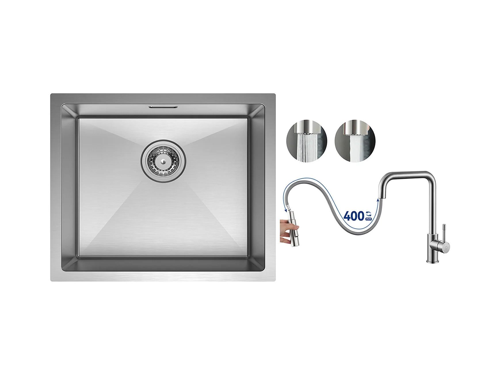 CECIPA MAX Évier de Cuisine 1 Bac Brossé Évier Inox 50*44CM + Mitigeur avec Douchette Extractible, Brossé