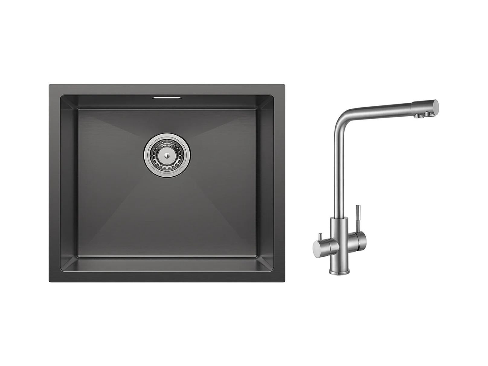 Cecipa max Évier 1 Bac 50*44cm Évier de Cuisine en Inox Noir Anthracite + Mitigeur de Cuisine à Ressort avec 3 Modes de Sortie D'eau, Brossé