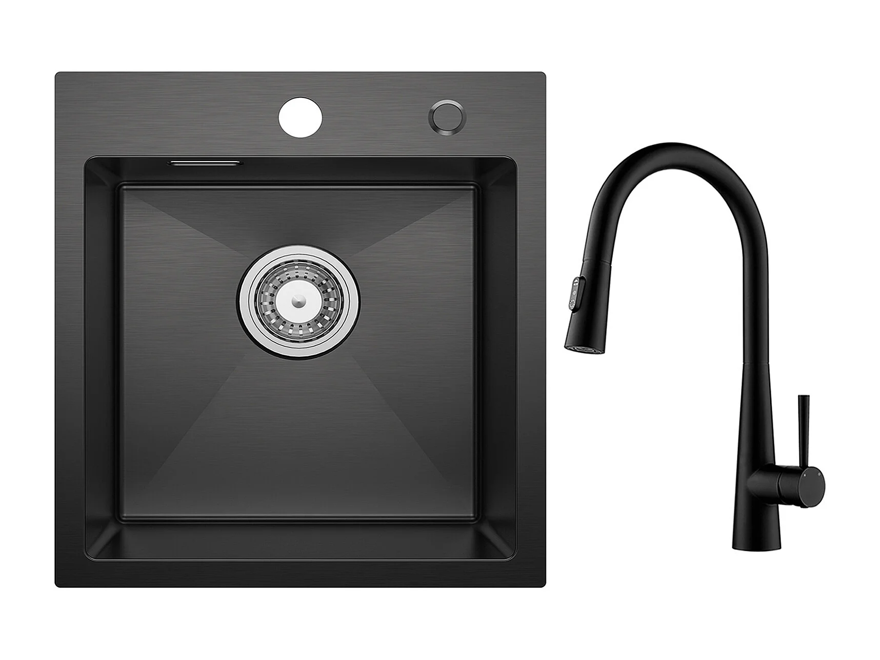 Cecipa max Evier de Cuisine Noir 40*45CM - Évier Inox 1 Bac avec Siphon et Trop-Plein + Mitigeur Cuisine à Ressort Brossé avec Douchette Extractible