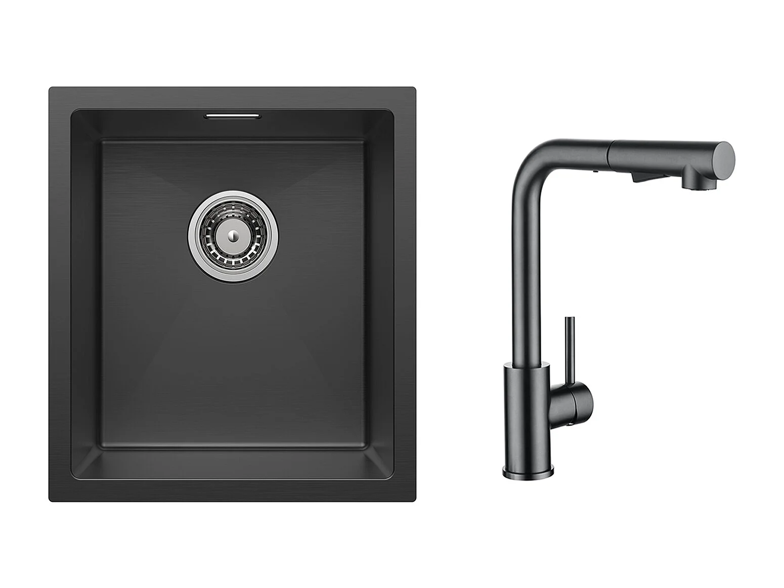 CECIPA MAX Évier 1 Bac en Acier Inoxydable Noir Évier Encastré 40*44cm + Flexible Mitigeur de Cuisine, 2 Types de Jets Robinet Extractible Brossé