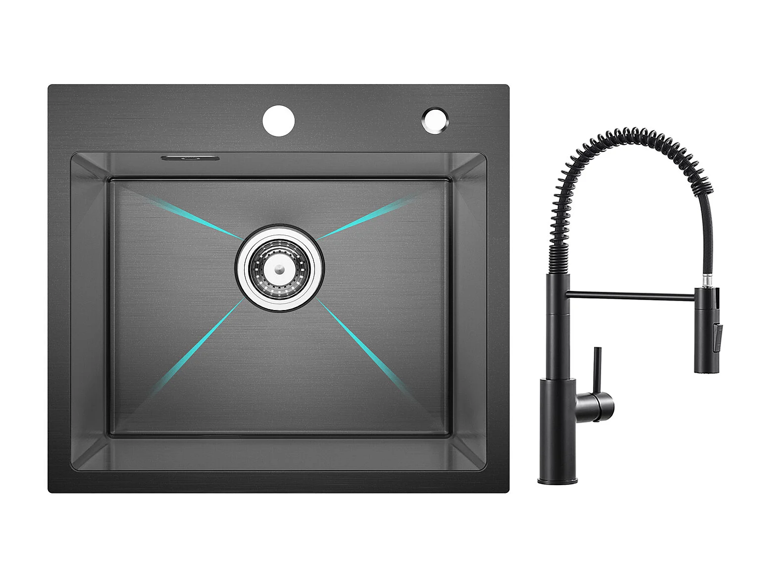 Cecipa MAX Évier Cuisine 1 Bac 50×45×18.5CM Évier Inox Noir + Mitigeur avec Douchette Extractible, Noir